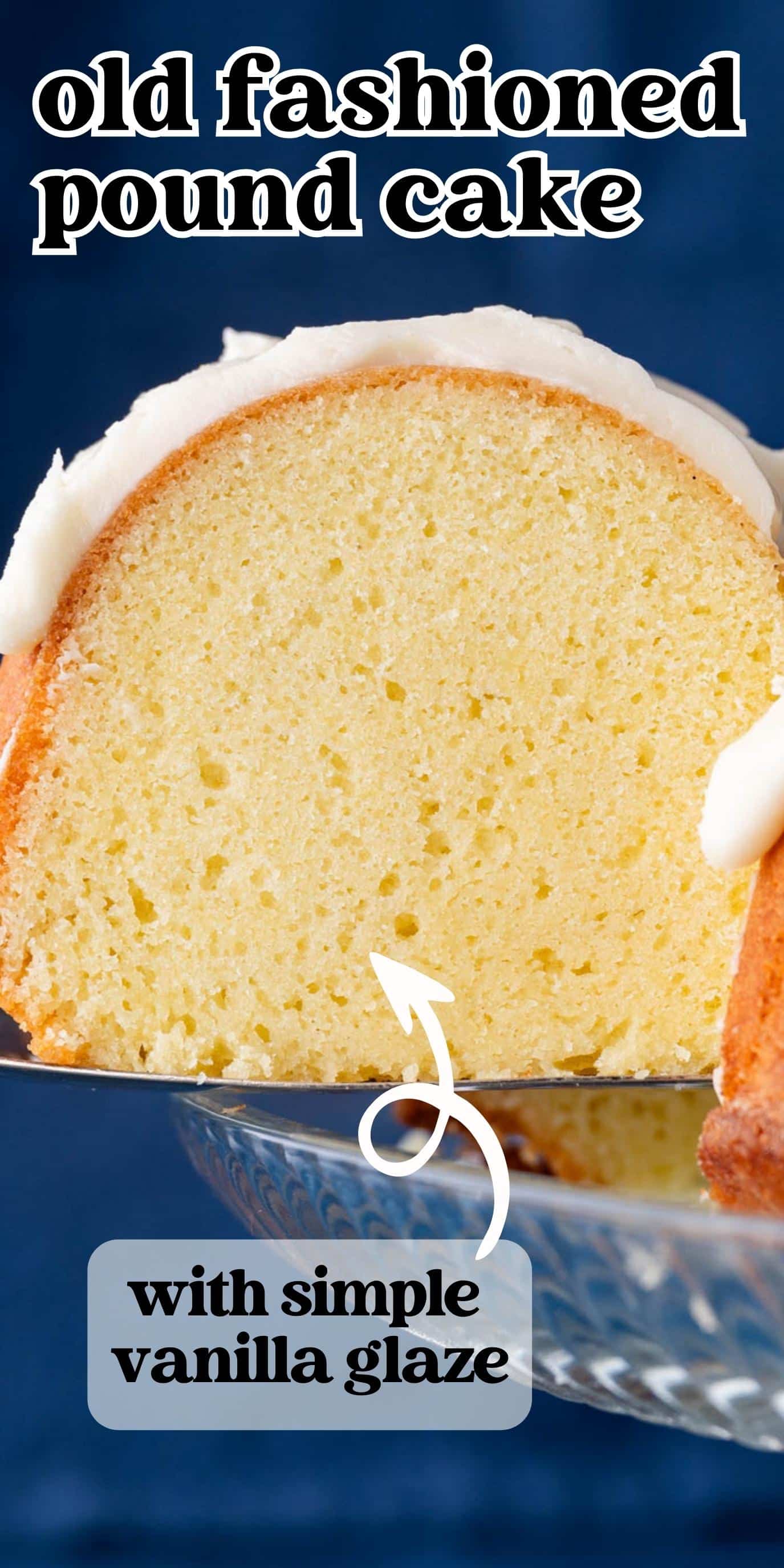 7 simple ingredients make up this classic, old fashioned pound cake. It’s thick and rich with a golden interior. Top with a sweet vanilla glaze for a simple dessert.