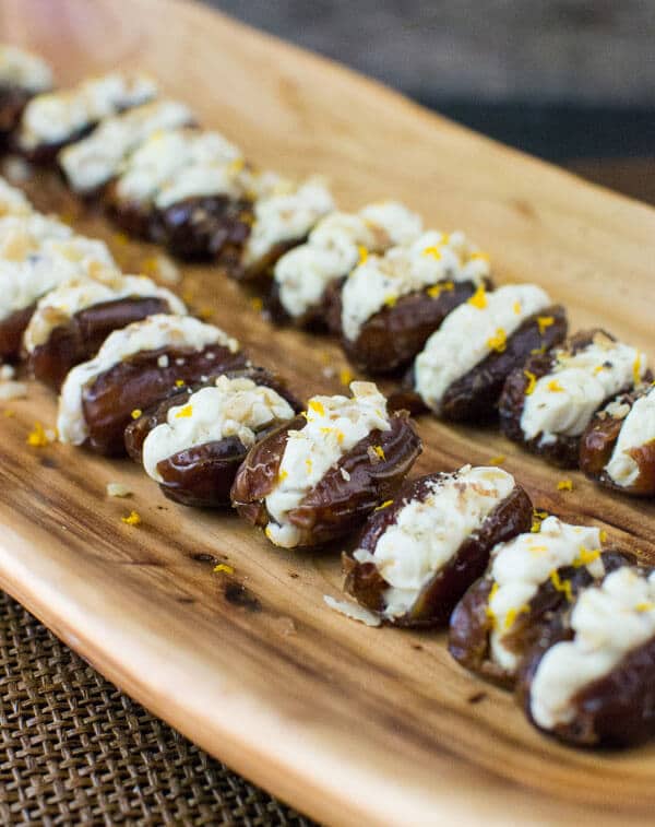 Dates stuffed with a lightly sweetened orange and honey cream cheese. Crunchy toasted walnuts make the perfect topping for this easy snack!