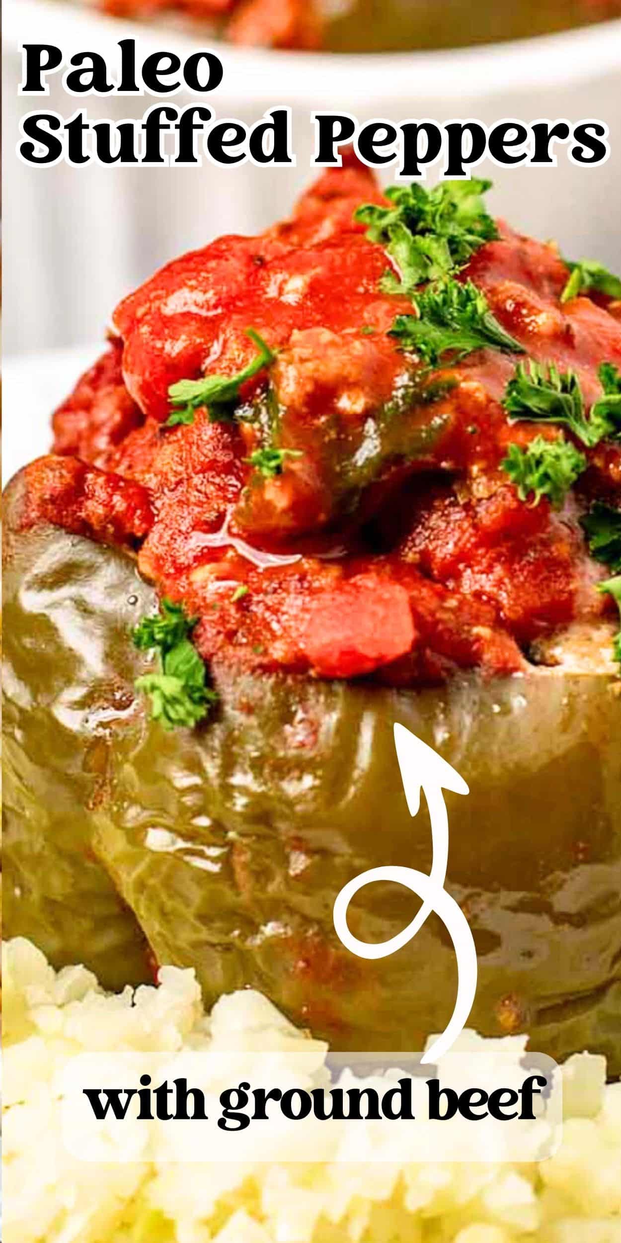 Paleo Stuffed Peppers are filled with Italian seasoned ground sirloin and slow cooked to perfection. Serve with cauliflower rice and smother in spaghetti sauce.