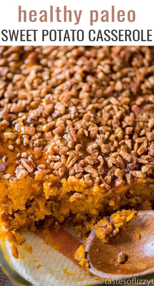 Whole30 sweet potato casserole is a healthy twist on a Thanksgiving side dish. Creamy sweet potatoes with a cinnamon pecan topping.