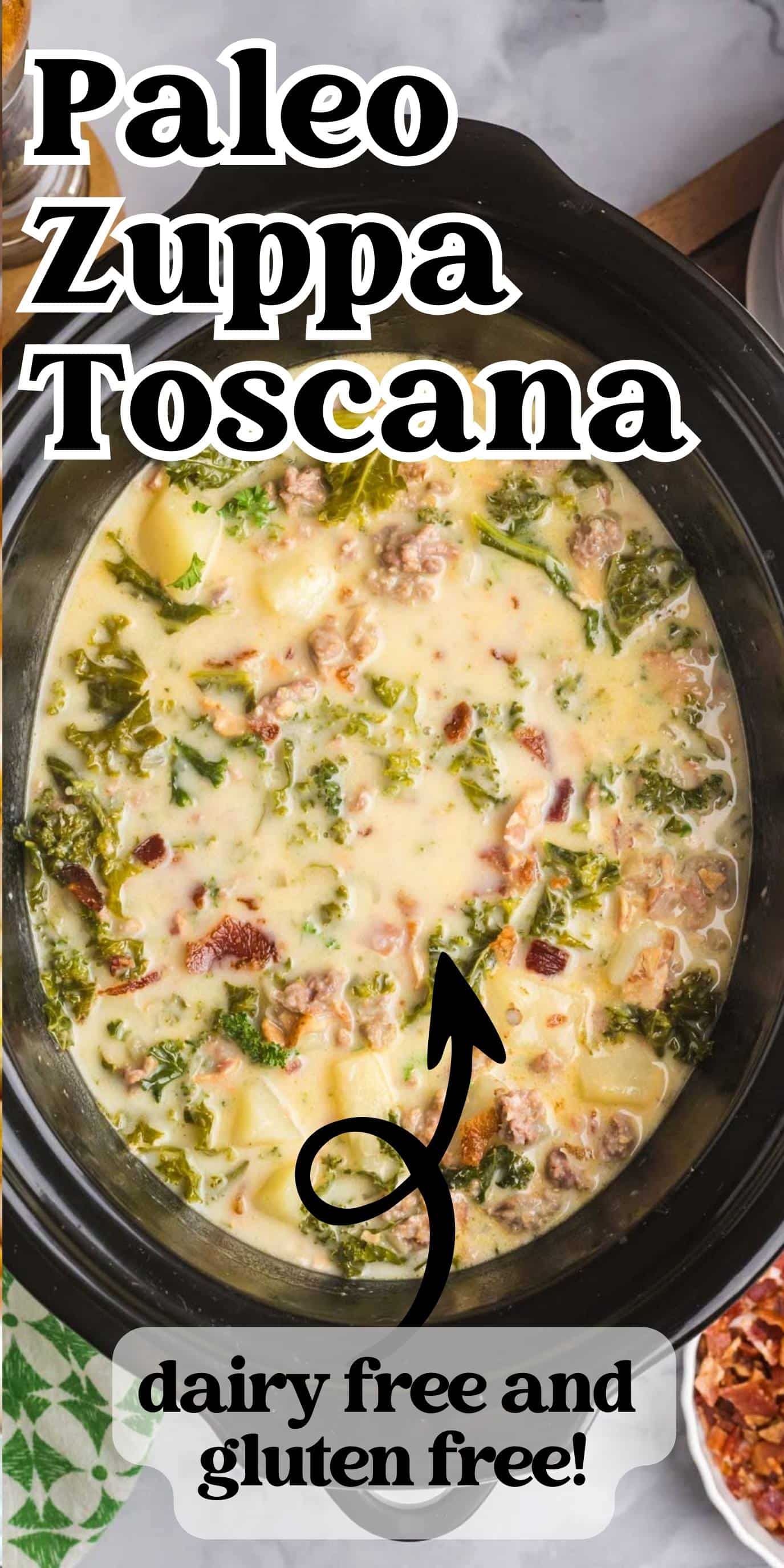 Paleo Zuppa Toscana is a rich soup filled with potatoes, kale, Italian sausage and bacon. It's easy to make this creamy dairy free soup in the slow cooker.