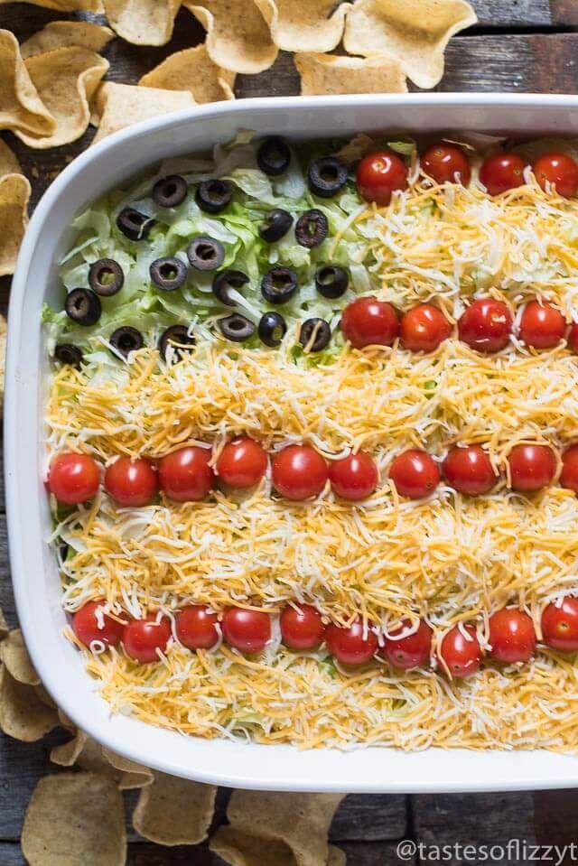 Bring this Patriotic Easy Layered Taco Dip to your next summer picnic! It’s a quick and easy side dish that you don’t have to bake. Serve with tortilla chips.