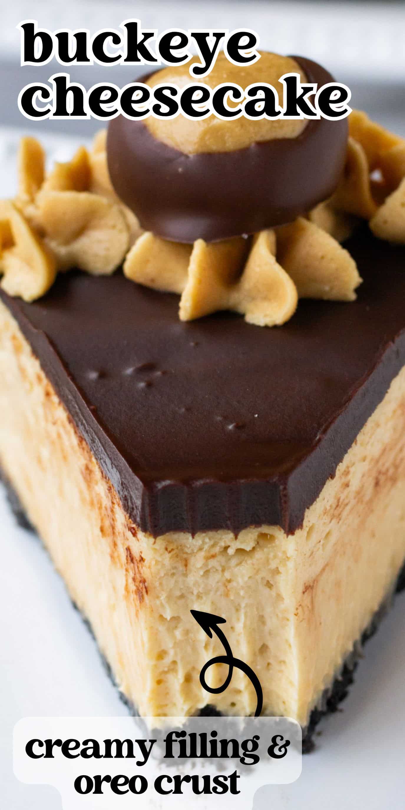 Rich, creamy, peanut butter buckeye cheesecake topped with sweet chocolate ganache and an Oreo cookie crust.