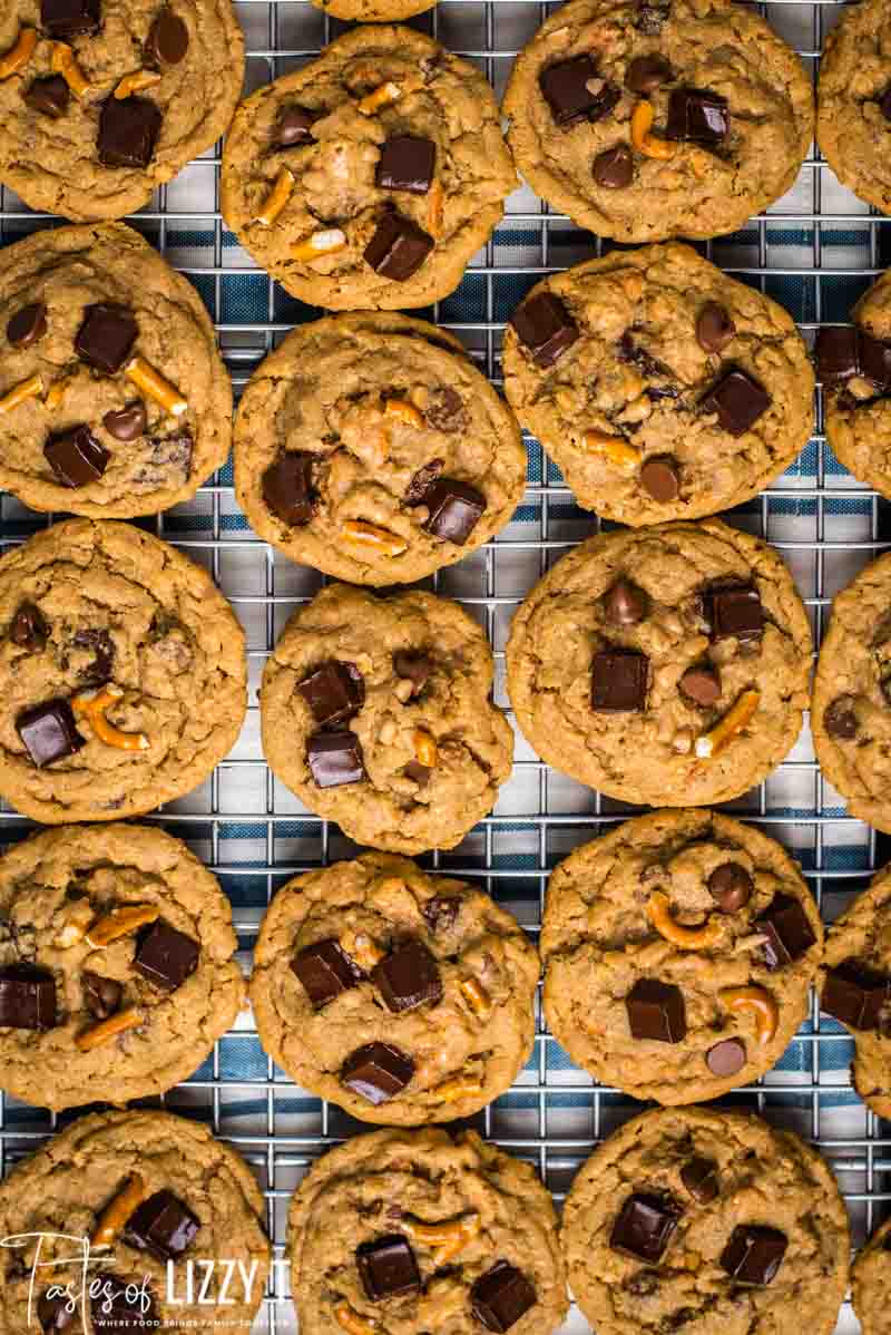 Thick, chewy, chunky peanut butter cookies are stuffed with peanut butter, chocolate, pretzels, peanuts, toffee, oatmeal and hints of cinnamon spice.