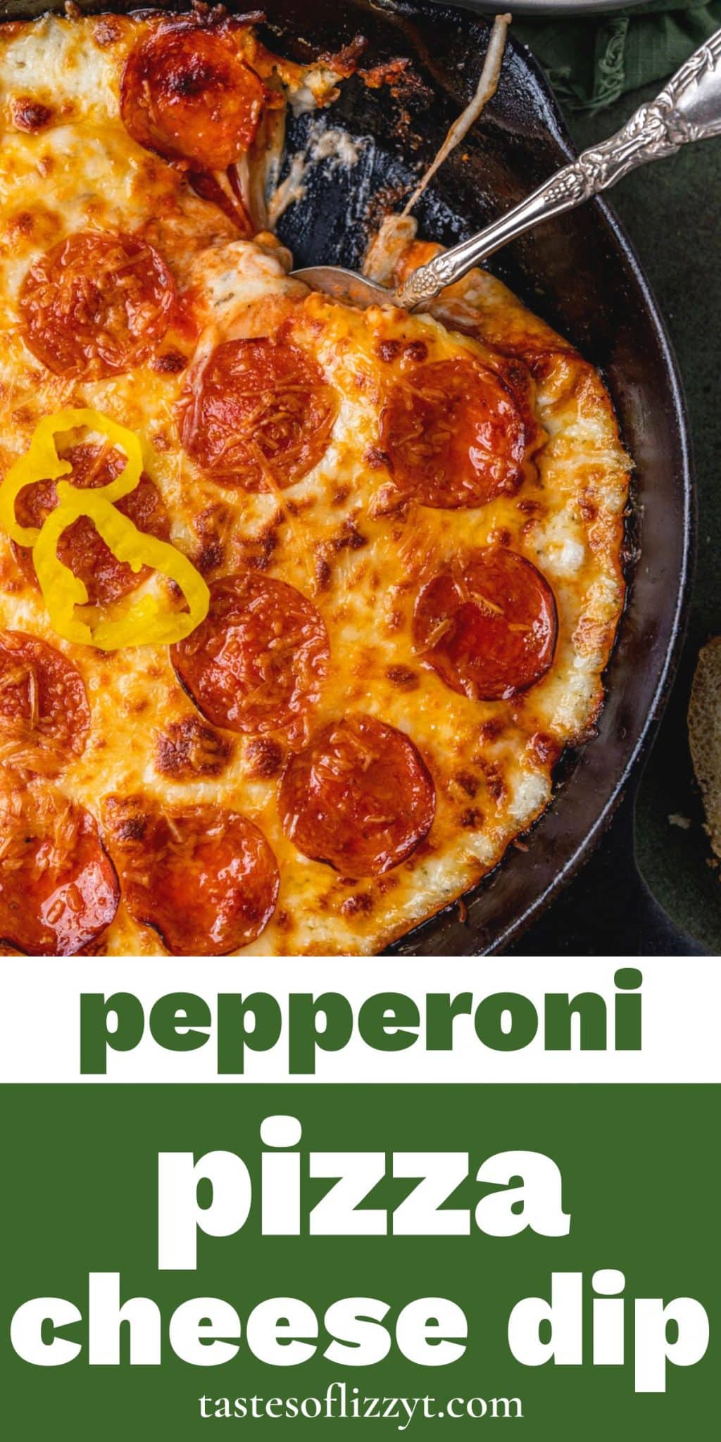 closeup of cast iron cheesy pizza dip with pepperoni on top