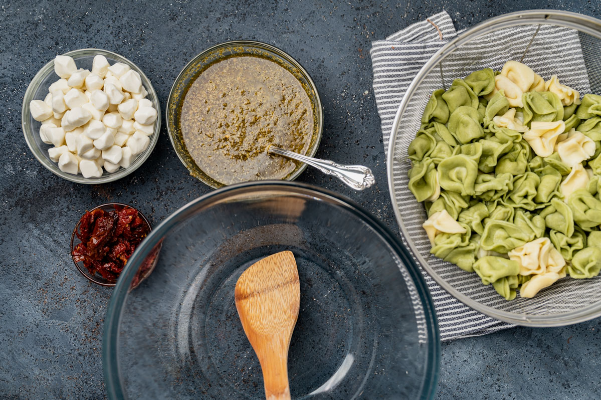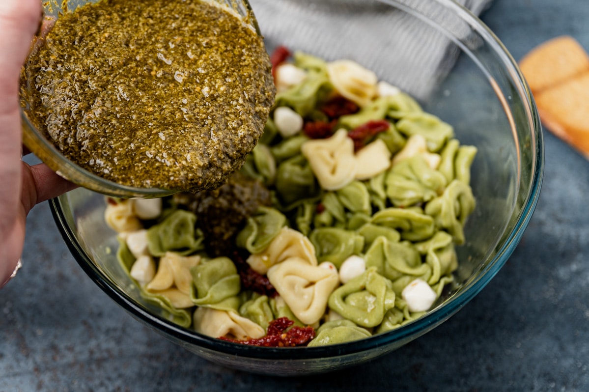 - Assemble the salad. Once the tortellini has cooled to room temperature, place it in a large bowl. Add the sundried tomatoes and mozzarella pearls. Add the pesto sauce and mix until combined.