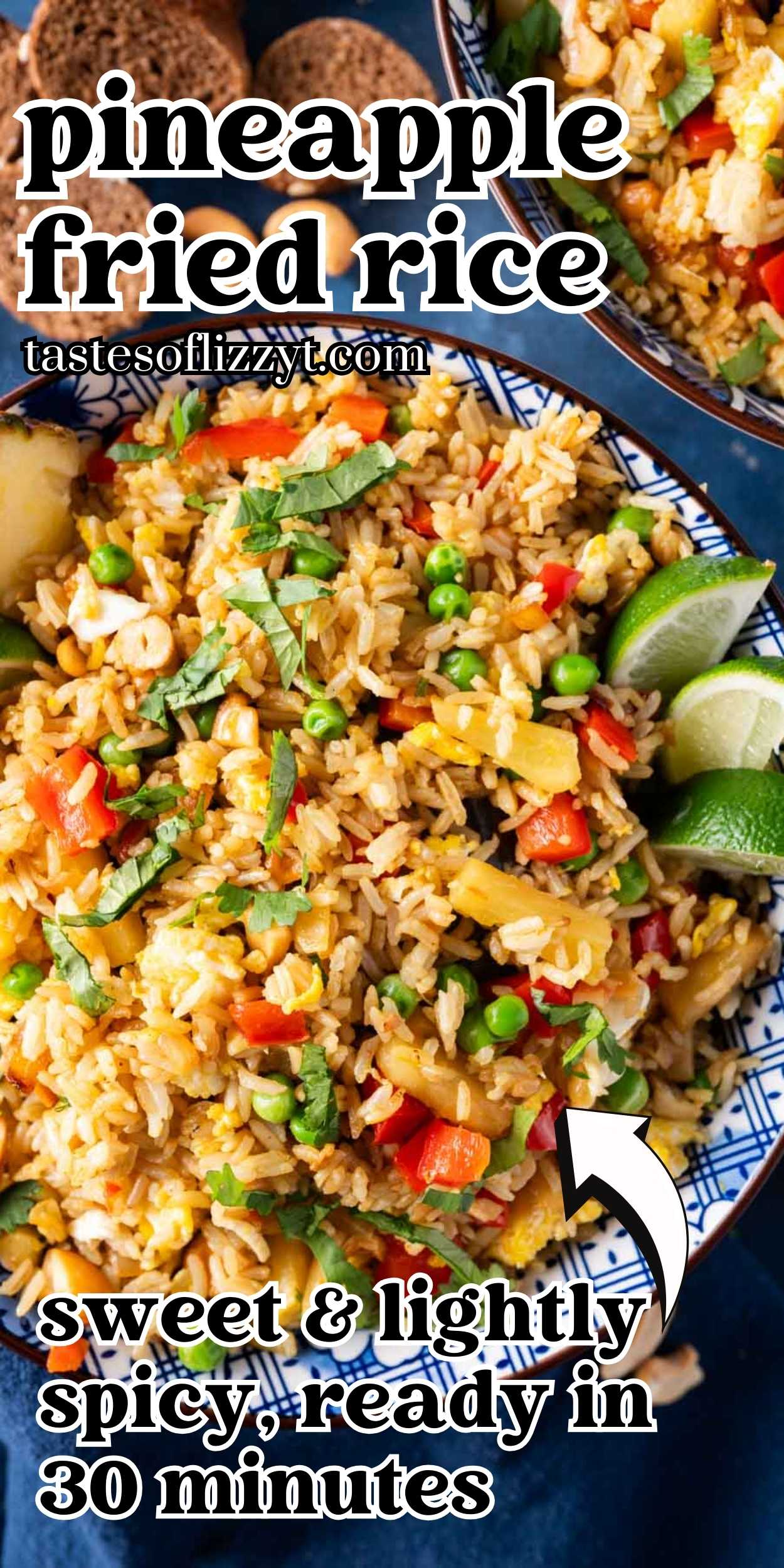 This pineapple fried rice recipe is loaded with the colorful peas and red bell pepper. Don’t skip the snipped cilantro and lime squeezed on top. It makes the rice taste so fresh!