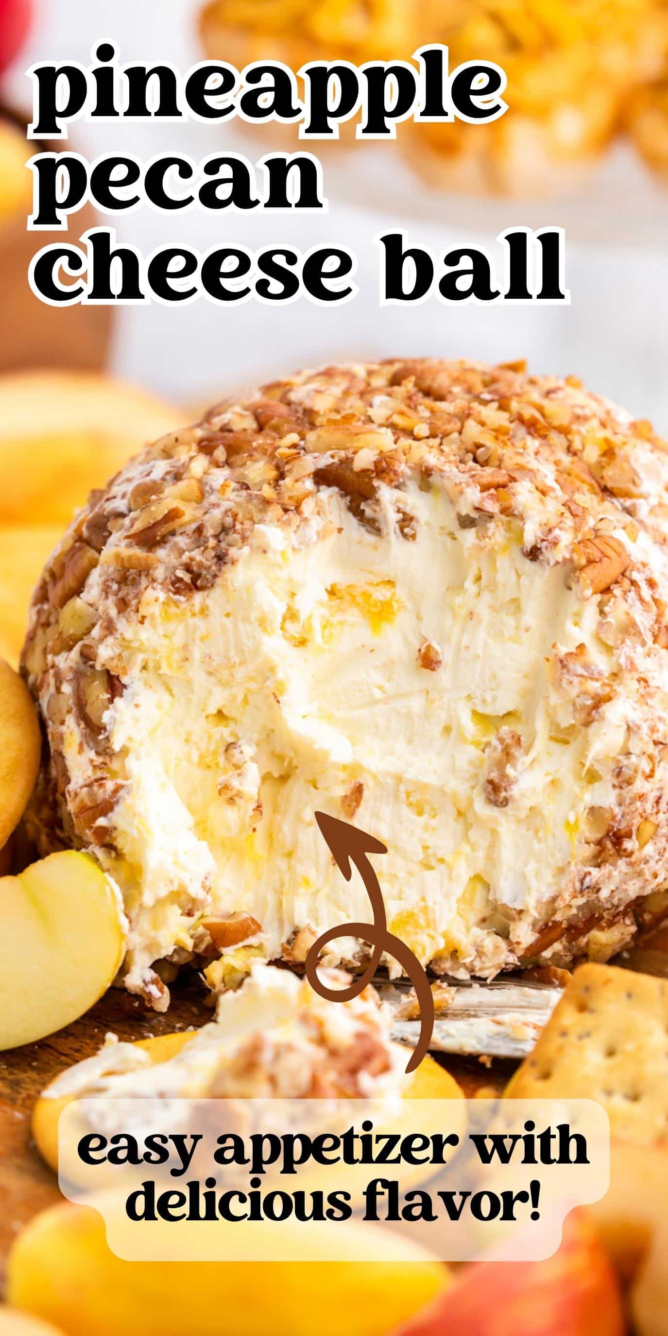This simple pineapple pecan cheese ball does have pineapple in it, but it also has two tablespoons of chopped onion and a dash of garlic salt. That onion and garlic salt cut the sweetness of the pineapple. And it was just perfect spread on some sea salt crackers.