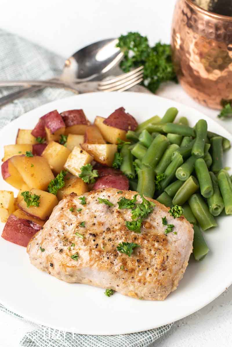 - You can control how thick the pork chops are. For this recipe you’ll want thick chops, about 1 1/2″ thick. This is so that the pork chops don’t overcook while the potatoes are roasting.