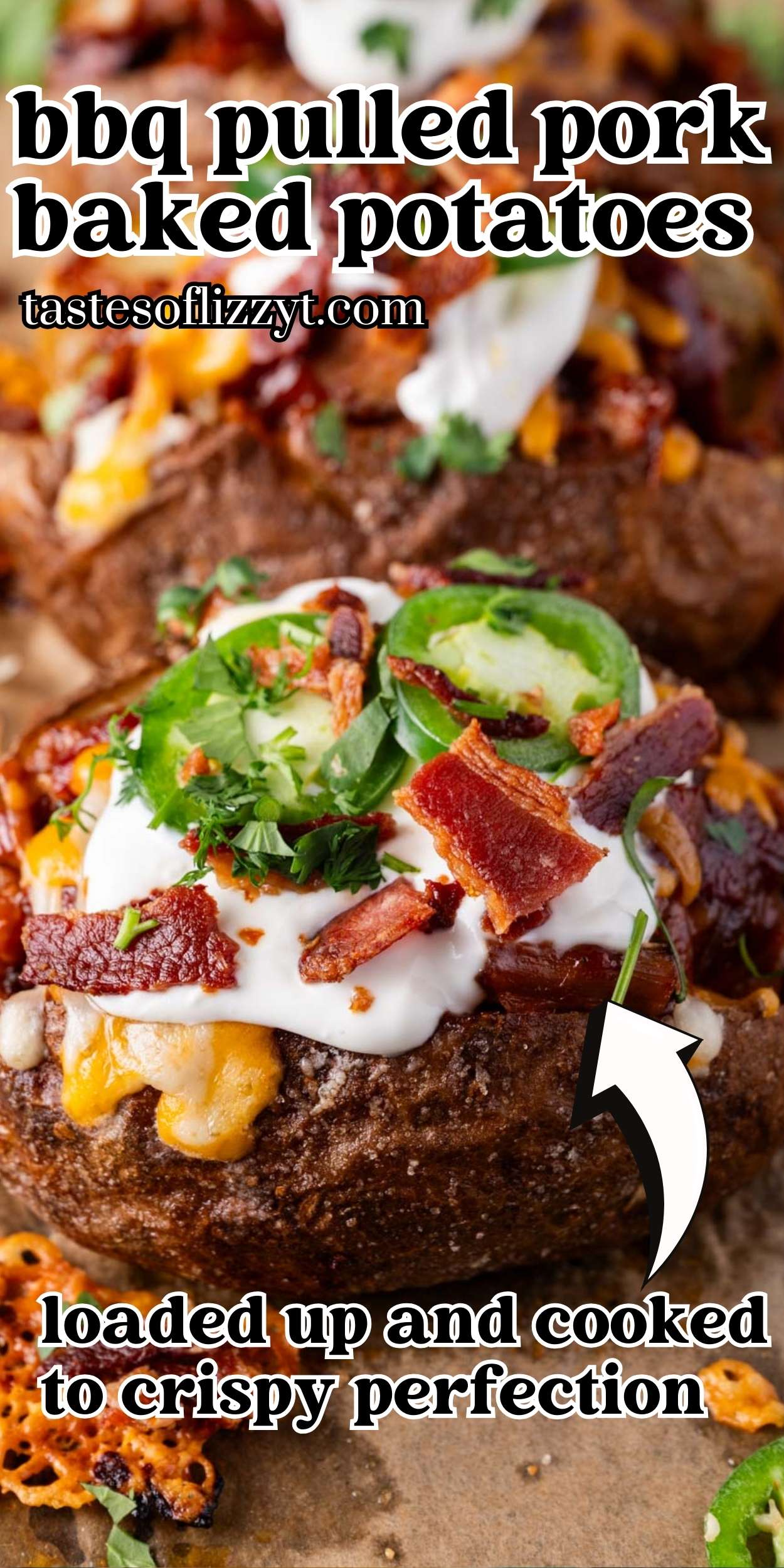 - Sprinkle some of each cheese over the potato, then add a scoop of pulled pork. Sprinkle with the rest of the shredded cheese.