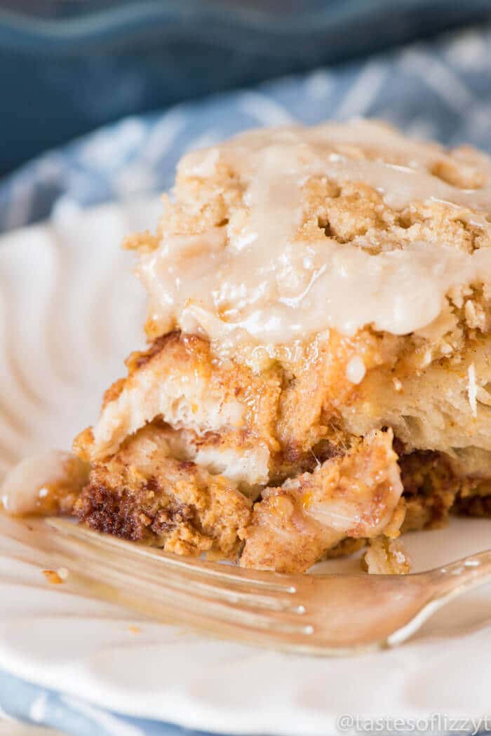 - Allow the cinnamon roll bake to cool for 5 minutes, then drizzle the glaze overtop.