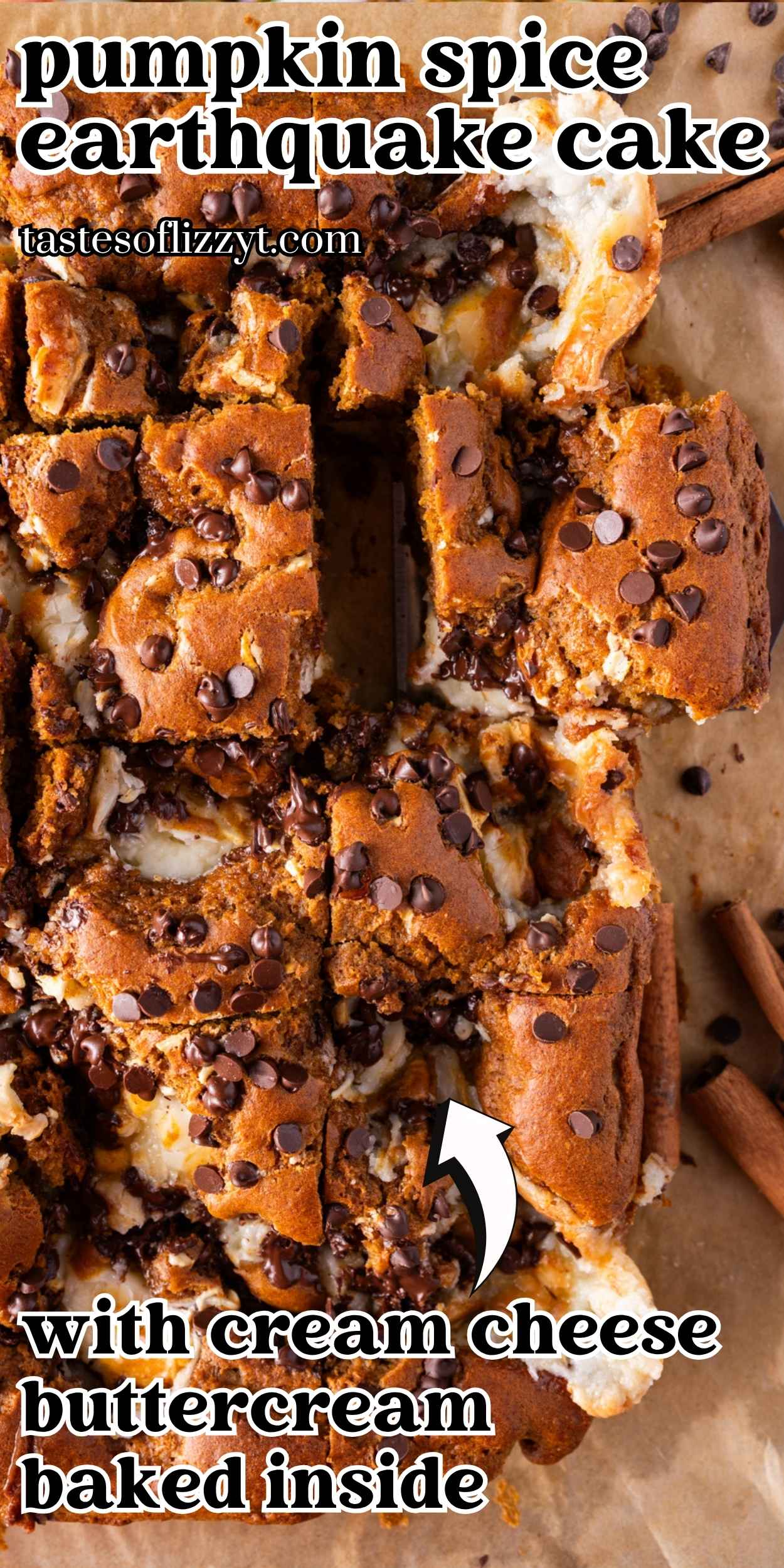 This easy pumpkin spice earthquake cake starts with a spice cake mix and has a creamy cheesecake layer swirled in the cake batter. Top with a few chocolate chips for a delicious easy pumpkin dessert.