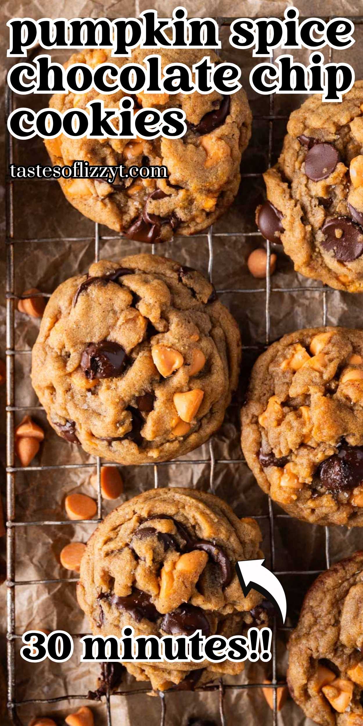 Chewy, soft, and easy pumpkin spice chocolate chip cookies are here! Made in 30 minutes with real pumpkin instead of an egg, molasses, and two kinds of chips. No mixer needed and no need to chill the dough.