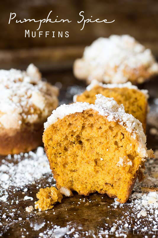 These pumpkin spice muffins are lightly spiced, soft and moist. The streusel and powdered sugar on top adds a hint of sweetness to each bite.