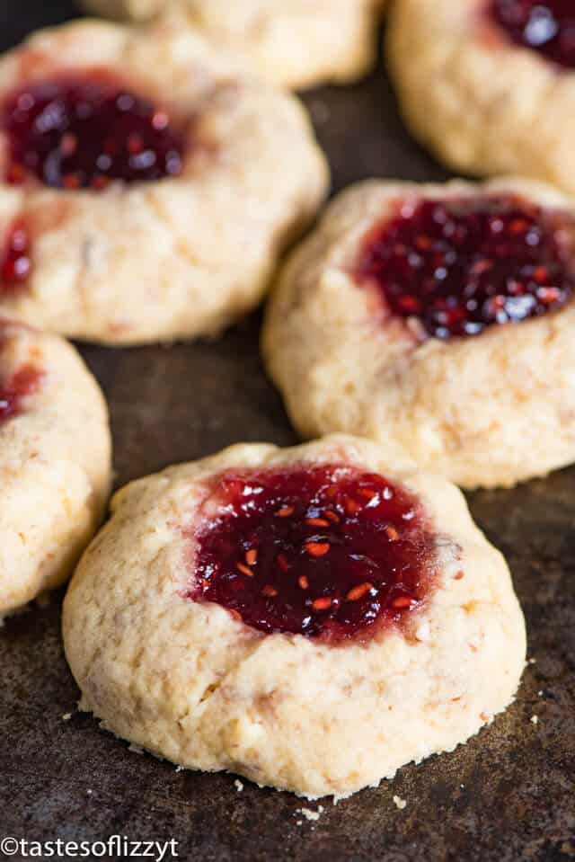 Have you ever made thumbprint cookies? I haven’t made them too much in the past, but we’ve really been enjoying them lately. They’re an easy old fashioned cookie that really have endless flavor combinations. Raspberry and almond is one of my favorite fruit flavor combinations. (Have you seen our almond raspberry bars?). These cookies have ground almonds baked right inside!