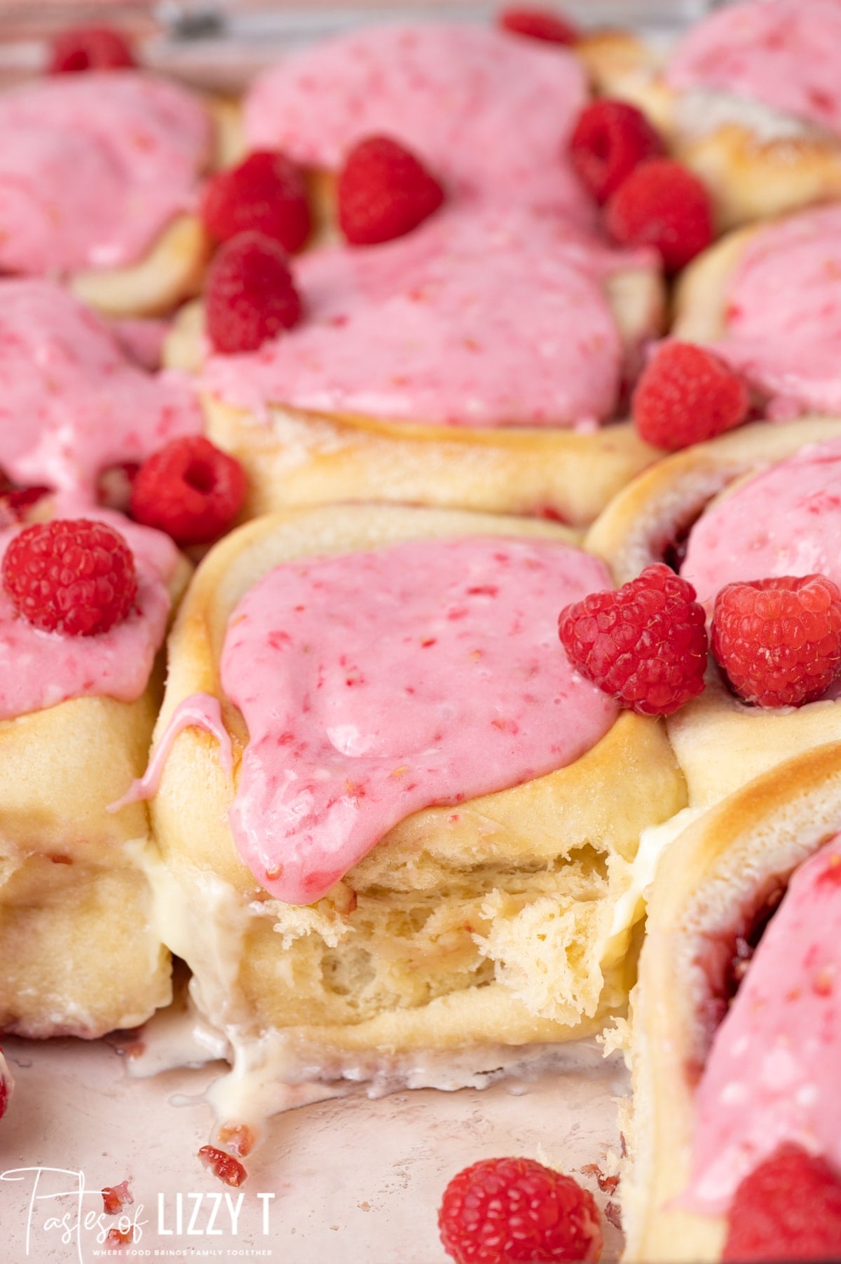 Raspberry jam and cream cheese fill these soft, fluffy Raspberry Sweet Rolls. Top with raspberry cream cheese frosting for a delicious breakfast!