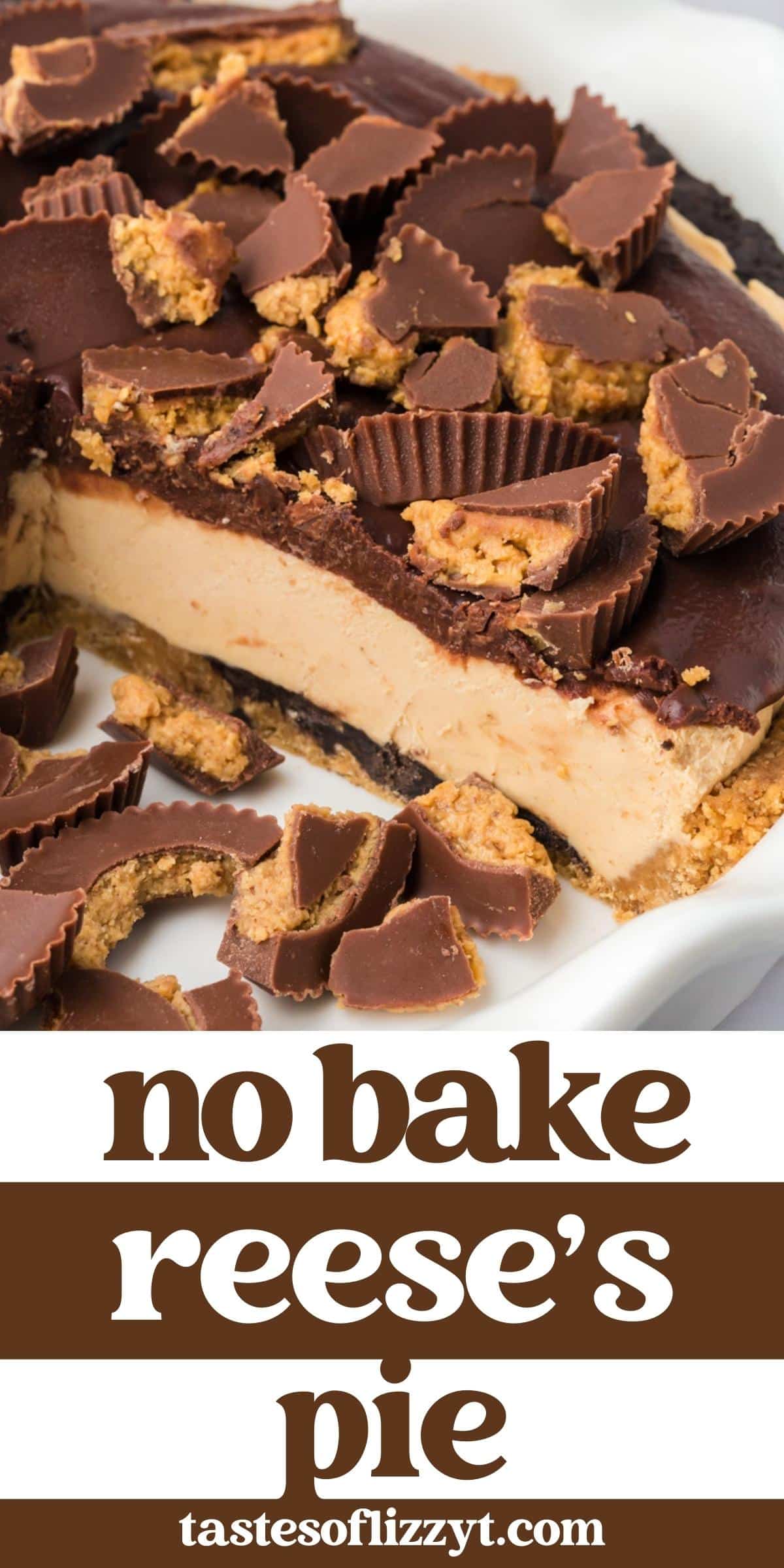 Reese’s Peanut Butter Cup Pie is a delicious no bake dessert. It has a double cookie crust, fluffy peanut butter filling and silky chocolate ganache.