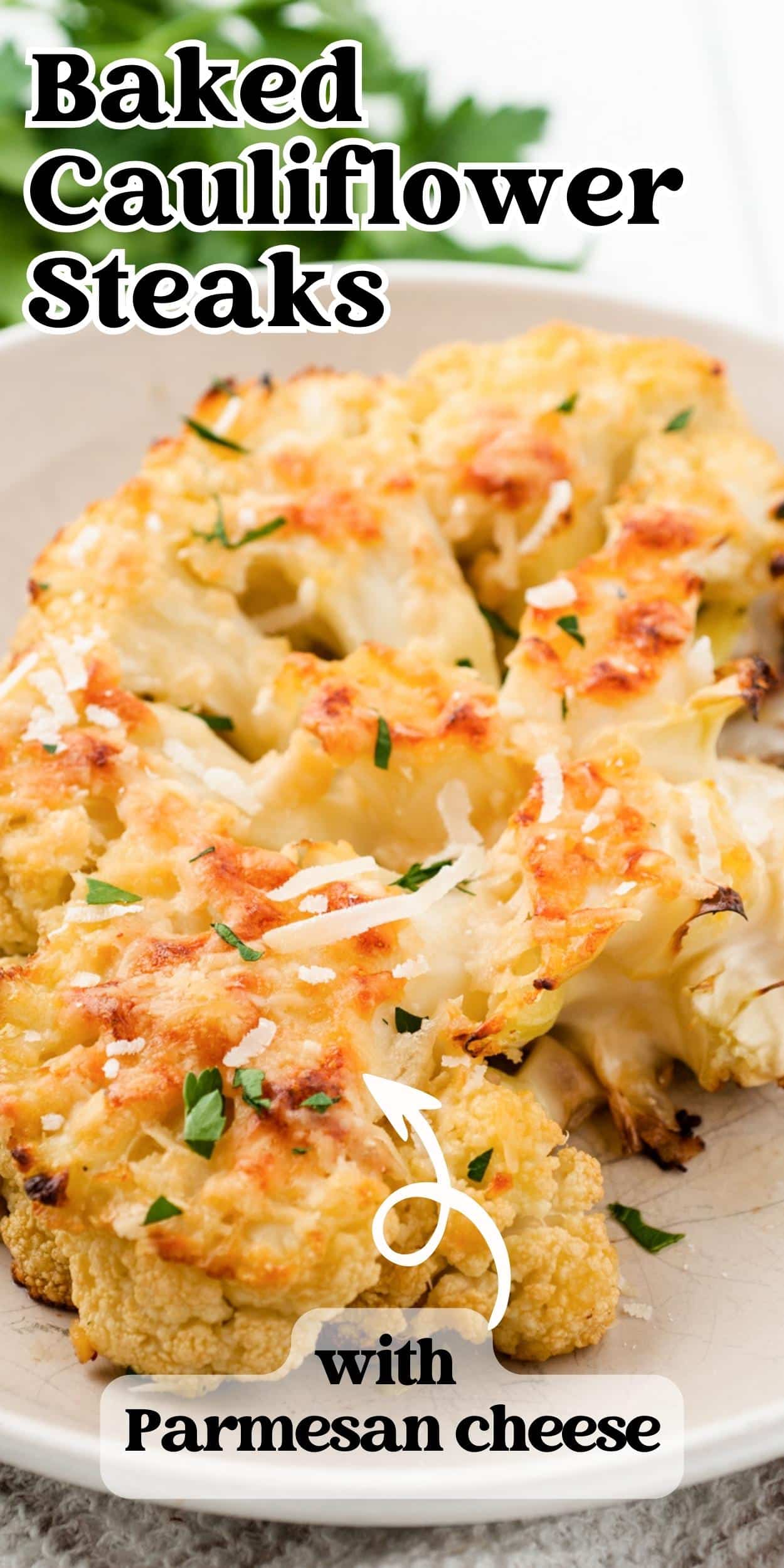 Sliced and baked cauliflower steaks with parmesan cheese make a gorgeous presentation. A low carb side dish for veggie lovers!