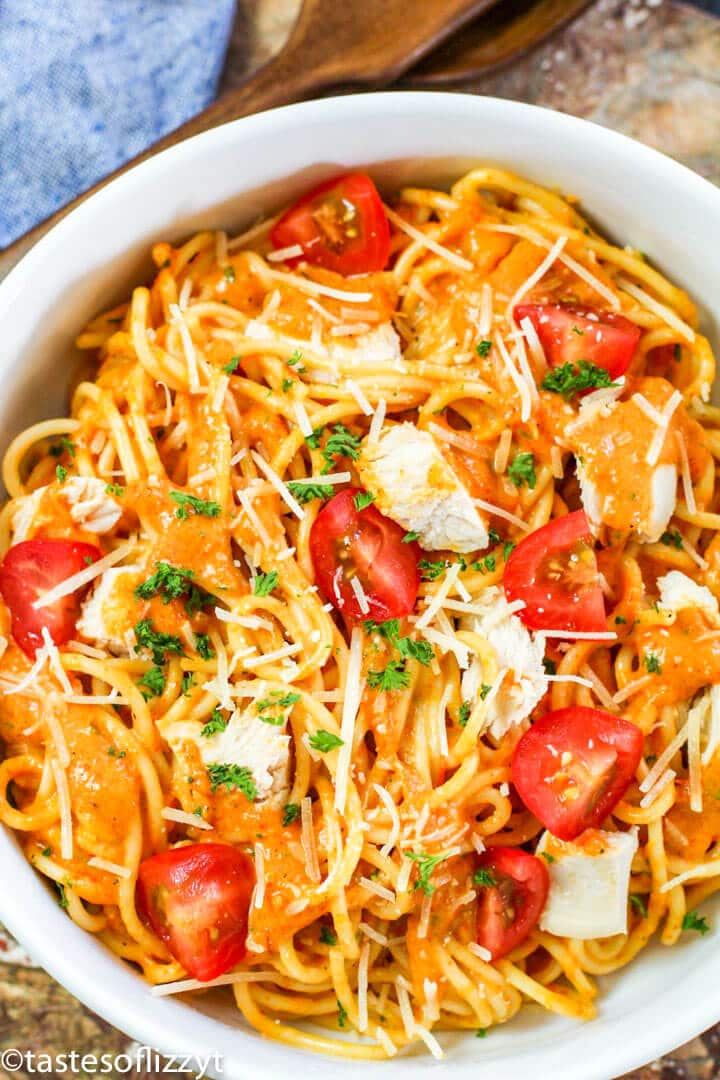 For this roasted pepper pasta dish, we’re adding in chopped chicken to our pasta for a high protein pasta dish. You can use rotisserie chicken, shrimp, or leave it as is to keep the dish vegetarian.