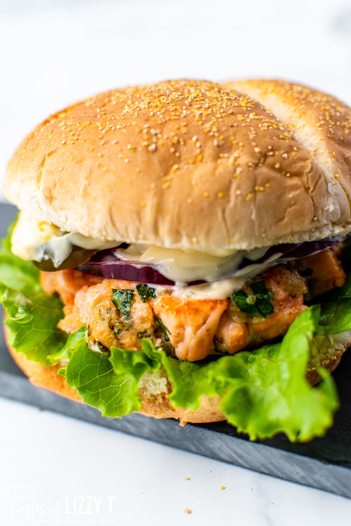 - Place lettuce on bottom bun, lay salmon patty on lettuce. Add onion and pickles on top. Spread generous amount of homemade tartar sauce to top bun and place on top.