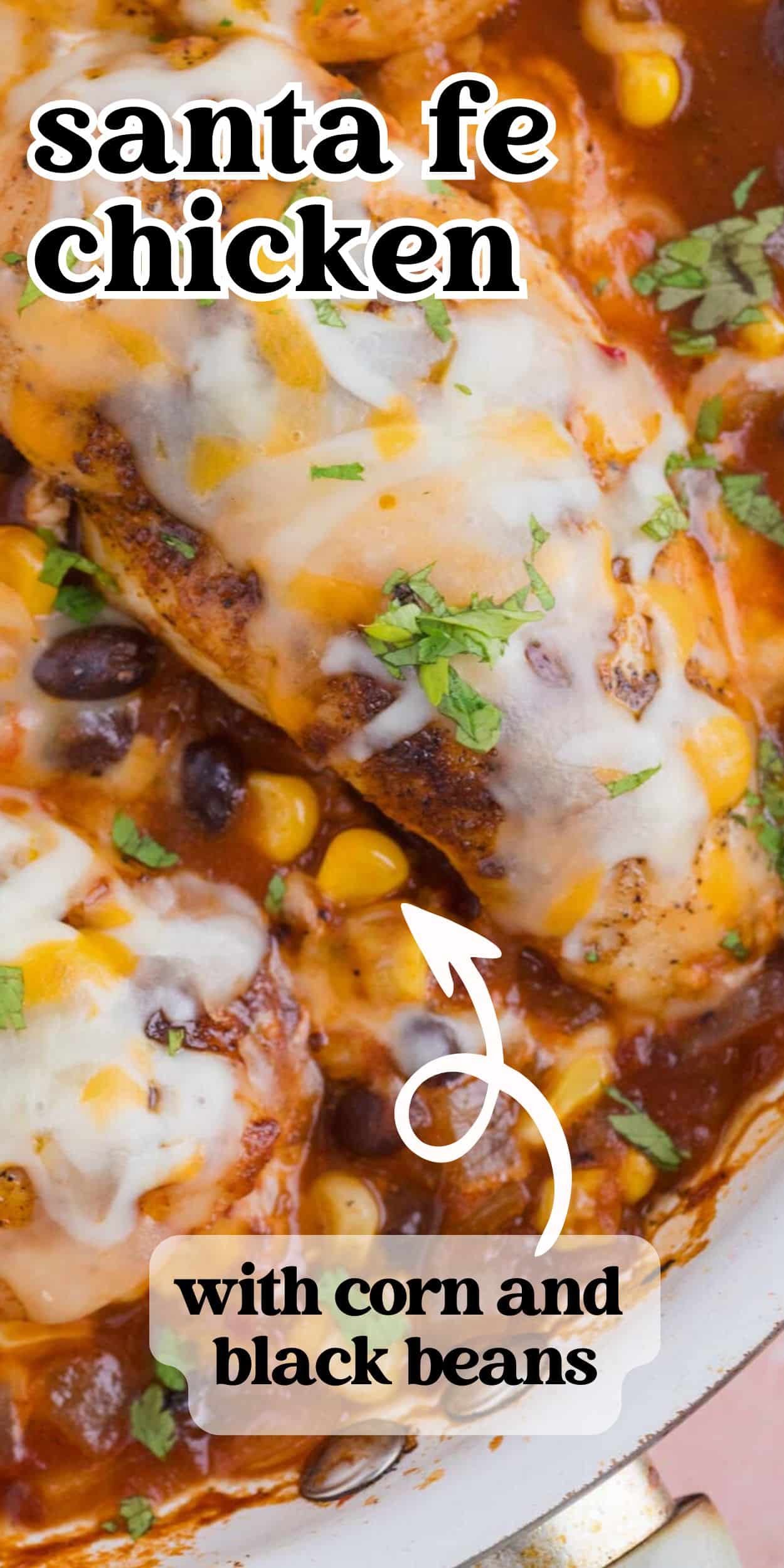 Santa Fe Chicken in a skillet is a flavorful recipe that's quick to make and perfect for any weeknight dinner. Packed with hearty black beans, sweet corn, and melted cheese.