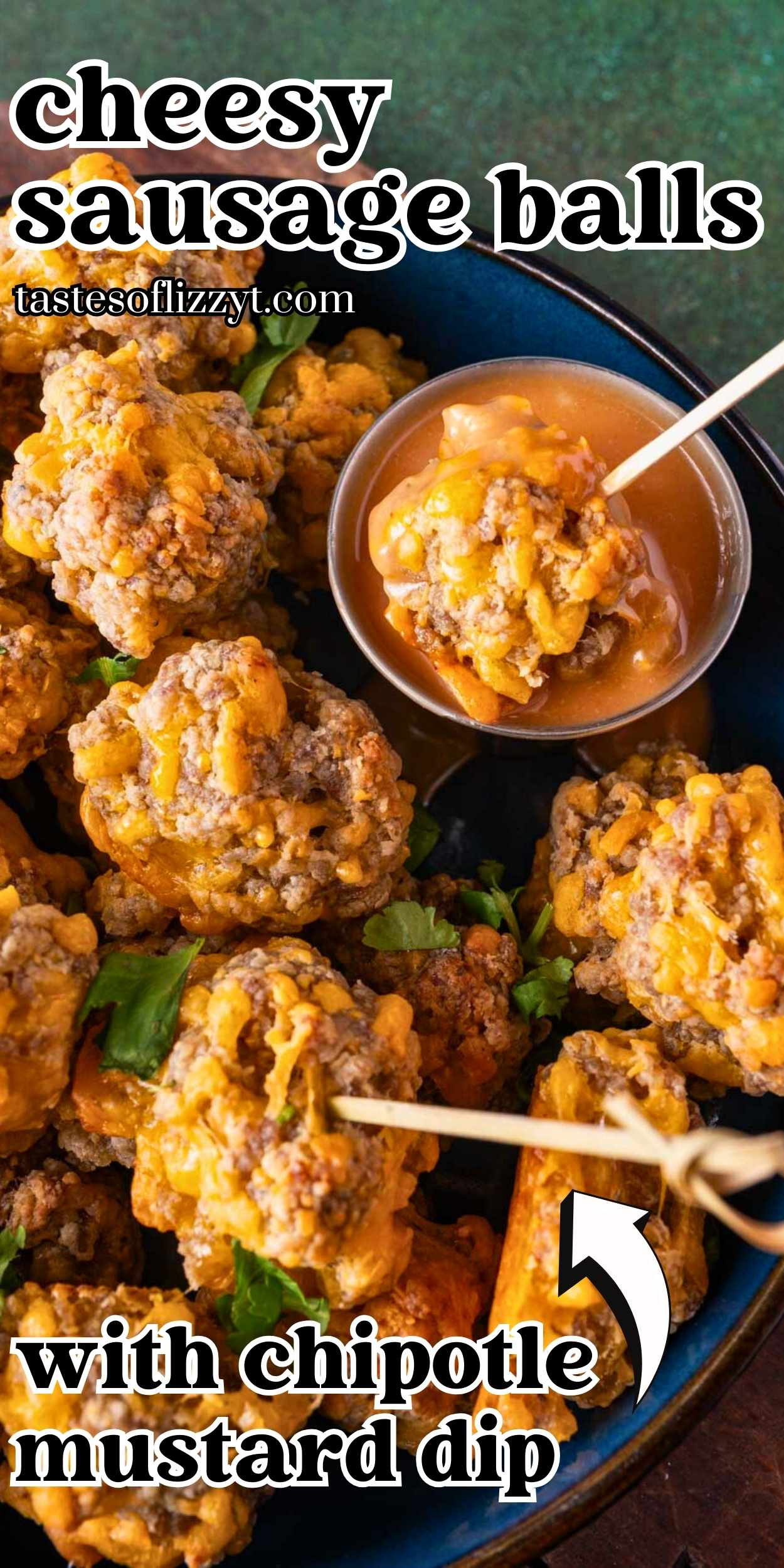 The best 3 ingredient sausage balls, served with chipotle honey mustard dipping sauce. They are a family favorite and make an easy meatball appetizer.