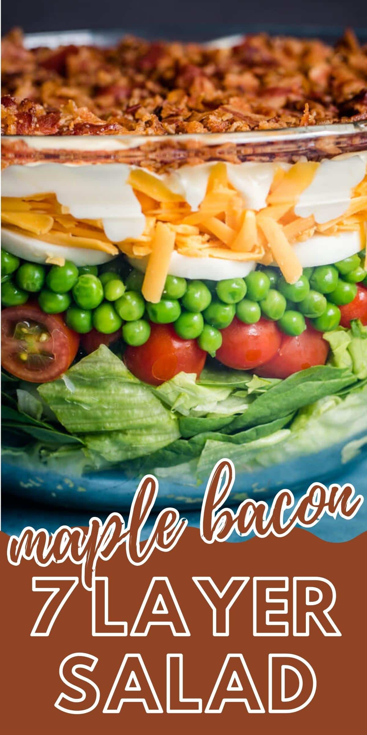 Our traditional seven layer salad recipe is made extra special with the addition of maple bacon on top. This high-protein layered salad perfect for picnics and potlucks.
