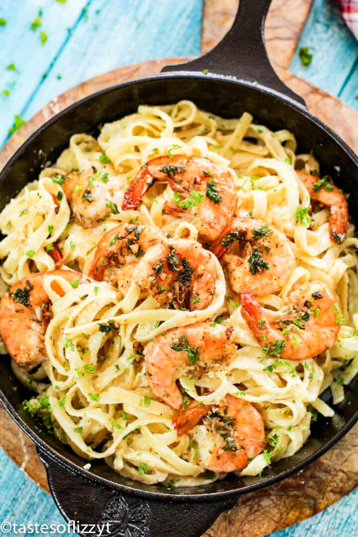 Just like the classic homemade alfredo pasta recipe, we follow the same steps, we just make the garlicky shrimp separate and toss it in when we add the al dente fettuccine.