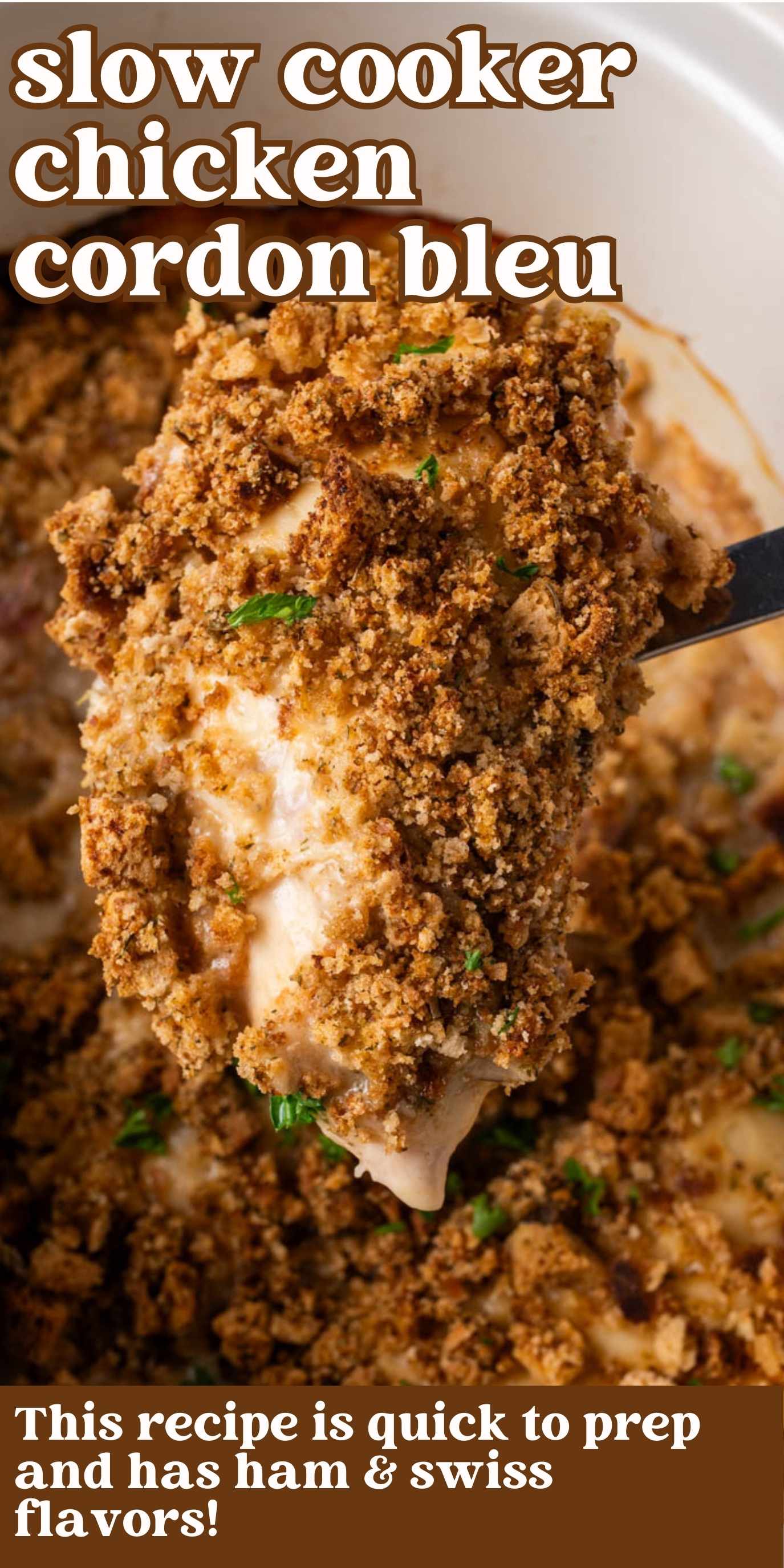This easy slow cooker chicken cordon bleu recipe has all the classic flavors you love, but without the rolling, stuffing, or extra dishes. Chicken cooks low and slow in a creamy sauce with layers of deli ham and swiss, then finishes with a buttery crumb topping.