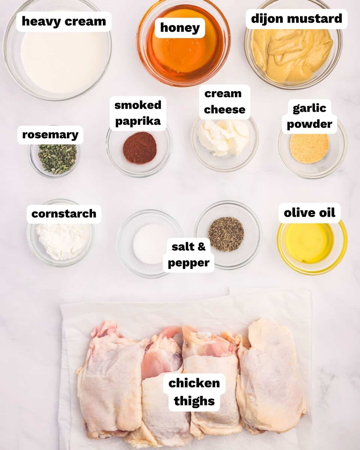 - Season both sides of the chicken thighs with salt, pepper, garlic powder, and paprika. 4 bone-in skin-on chicken thighs, 1 ½ teaspoons salt, 1 teaspoon ground black pepper, 1 teaspoon garlic powder, ½ teaspoon smoked paprika