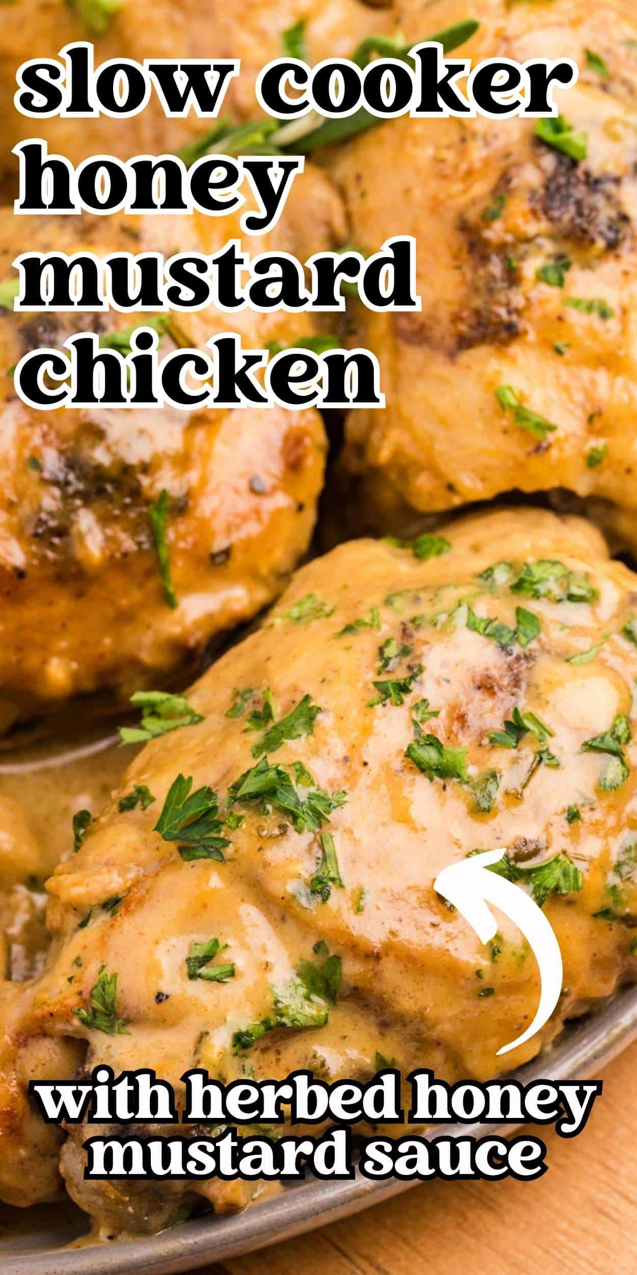 This slow cooker honey mustard chicken is easy to make with pantry ingredients. Tender, juicy chicken with a sweet and tangy herbed honey mustard sauce.