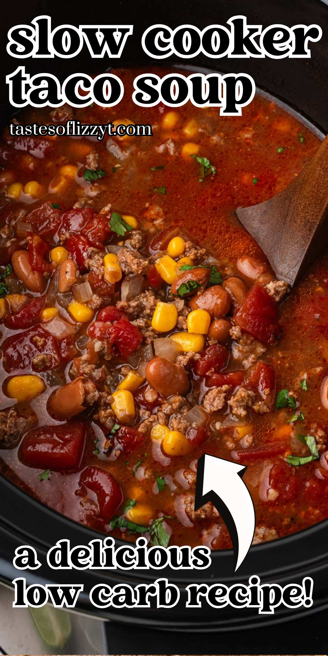 Enjoy the all the flavors of tacos in this easy Slow Cooker Taco Soup. This low carb soup recipe is a simple dinner for weeknights, game day tailgating or a taco Tuesday twist.