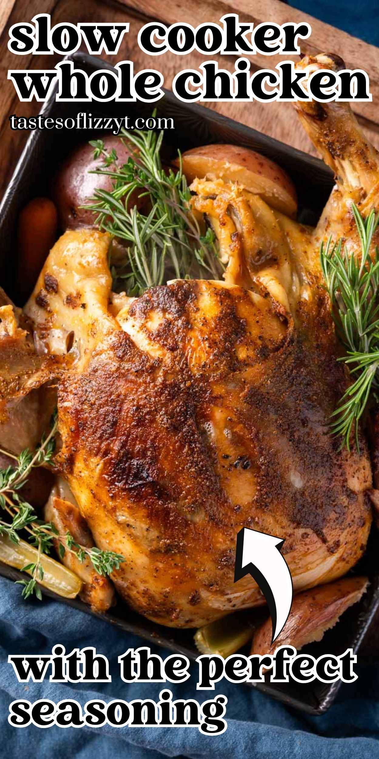 "Rotisserie" slow cooker whole chicken with crispy skin makes a foolproof, comforting dinner that is economical. Use the roasted chicken in your favorite chicken recipes.