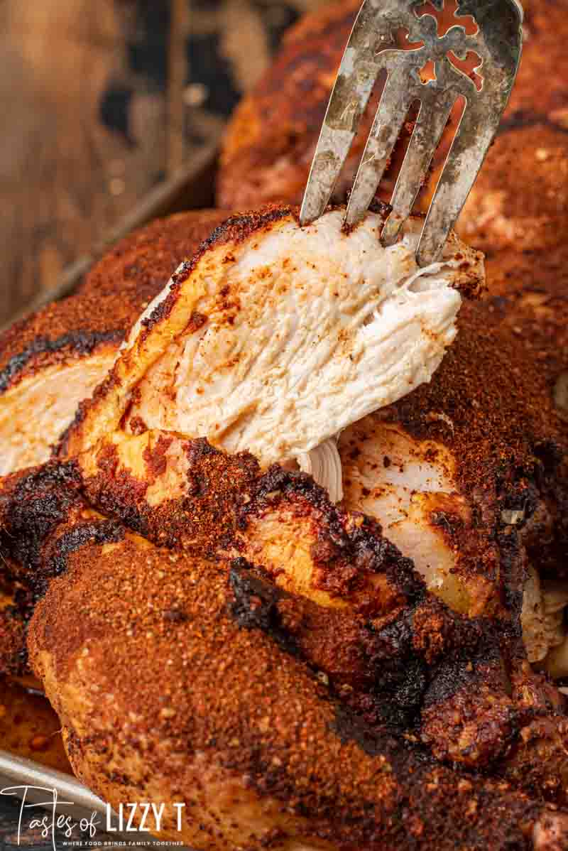 Smoke for about 5 hours or until an instant-read thermometer reads 160℉ when inserted into the thickest part of the breast. The finished internal temperature will rise to 165℉ in the breast as the chicken rests. Tent the chicken with foil and let rest for 15 minutes before carving. This is important so all of the juice stays in the chicken instead of releasing when you slice.