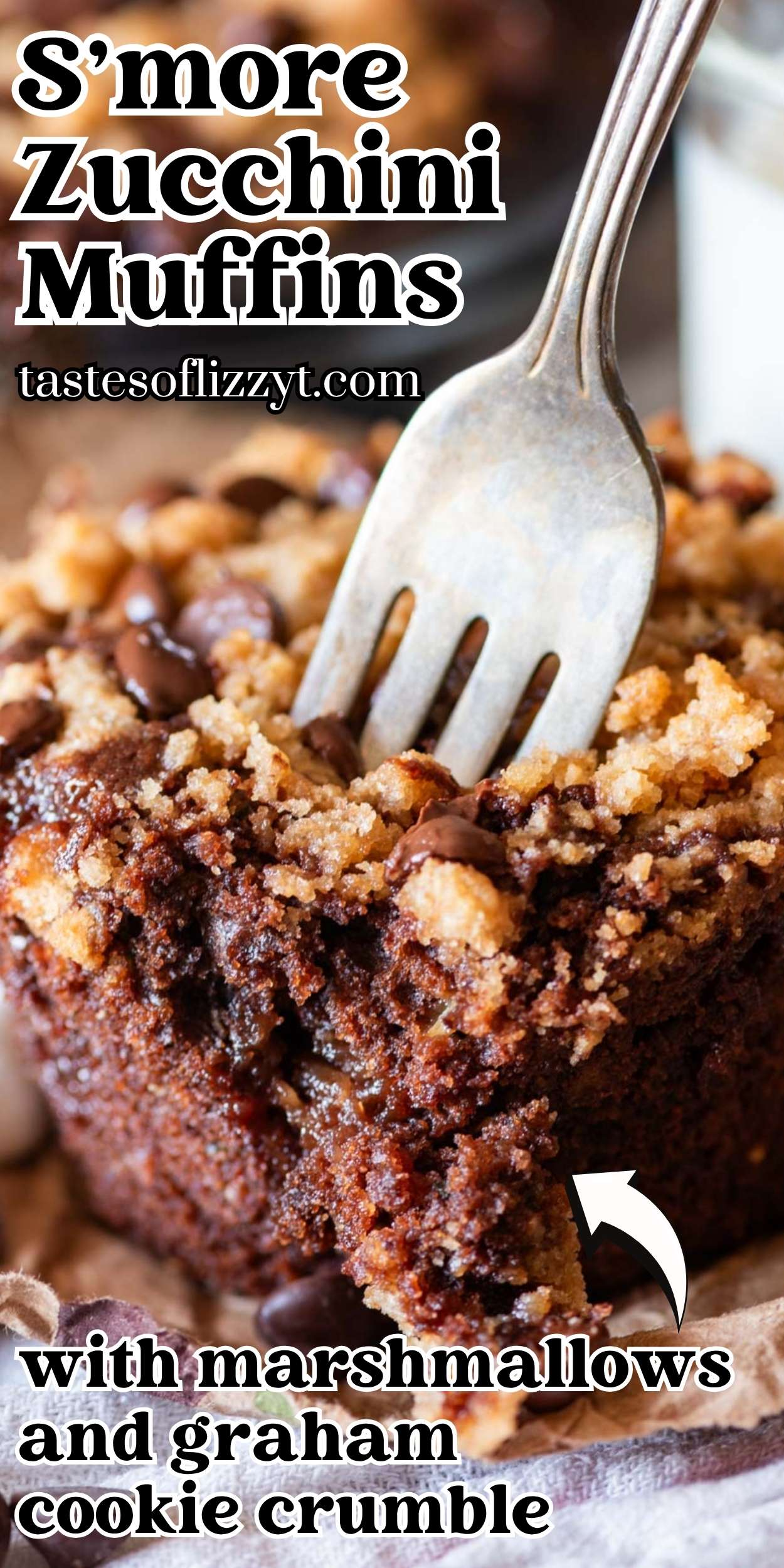 Soft, thick and rich s’more zucchini muffins are filled with chocolate, marshmallows and buttery graham cracker cookie crumble. The secret to their moist texture is zucchini.