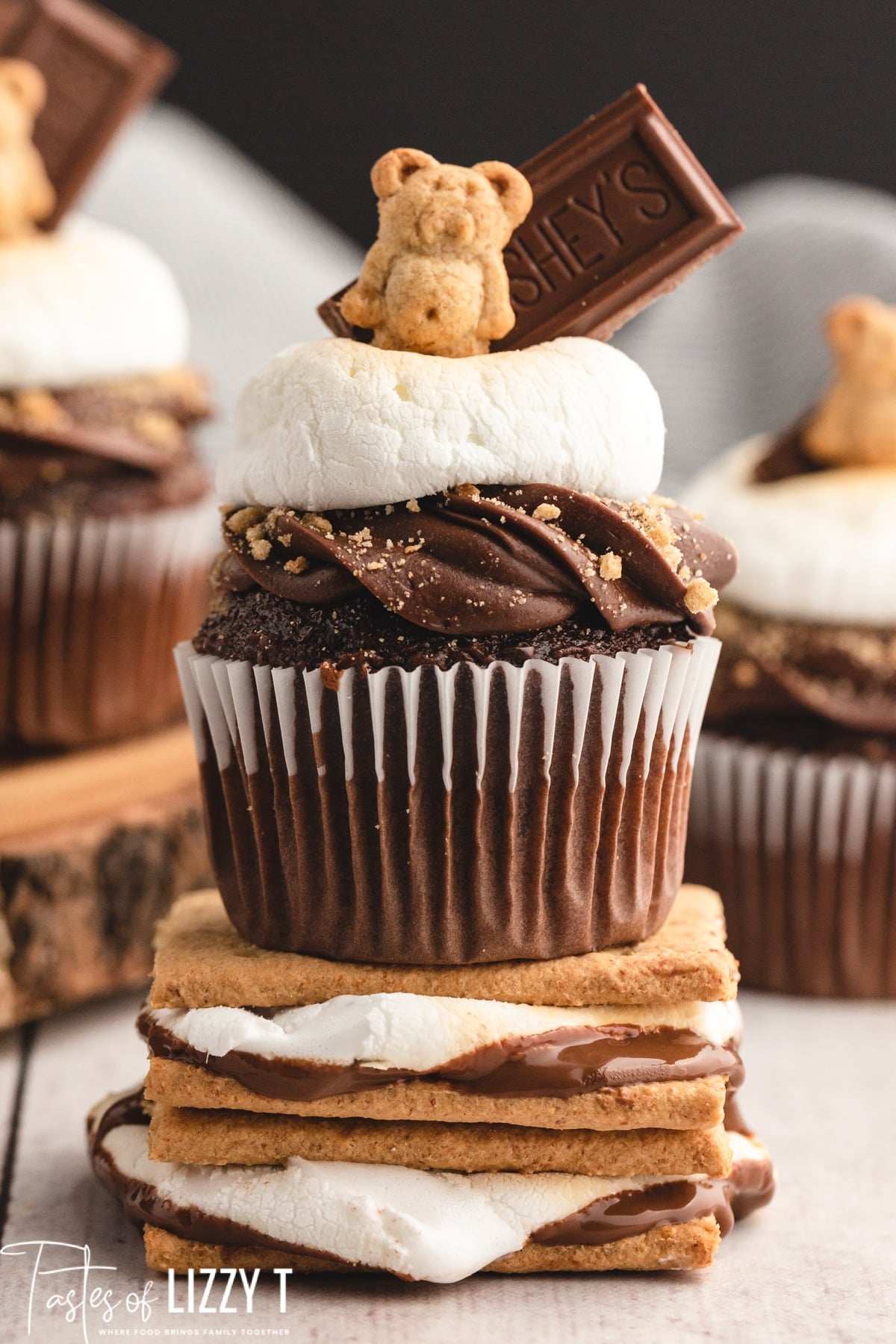 S'mores cupcakes are loaded with chocolate frosting, graham cracker crumbs, toasted marshmallows and teddy grahams. Fun for a summer party!