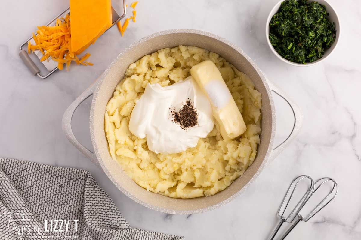 - Assemble the potatoes. Drain the water off the potatoes and mash the potatoes with a potato masher. Add the sour cream, salt, and pepper to the potatoes. Beat the potato mixture until it is fluffy. Stir the drained spinach into the mashed potatoes.
