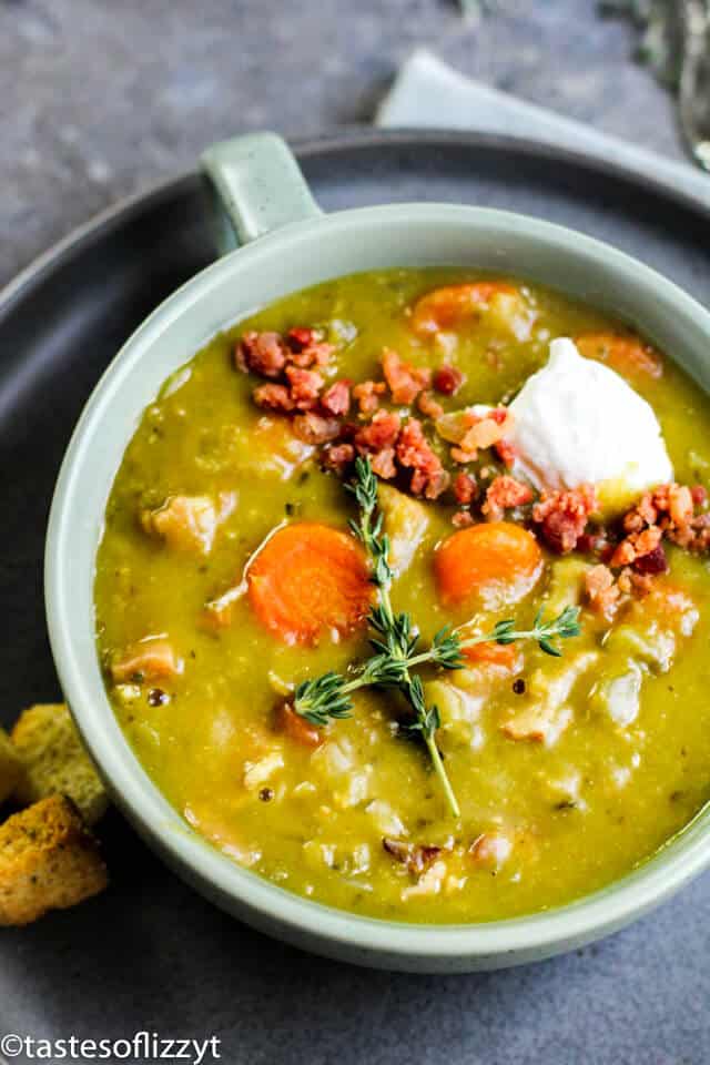 So….I’m not one that would say I love peas. I eat them in casseroles and mixed with mashed potatoes (drowned in gravy of course). I never really thought I’d crave split pea soup. But this soup was AH-mazing. Maybe it was the bacon and ham added. Maybe it was the fresh thyme. Maybe it’s the loads of garlic. Any way you look at it, this easy soup recipe is going to be a regular in our house!