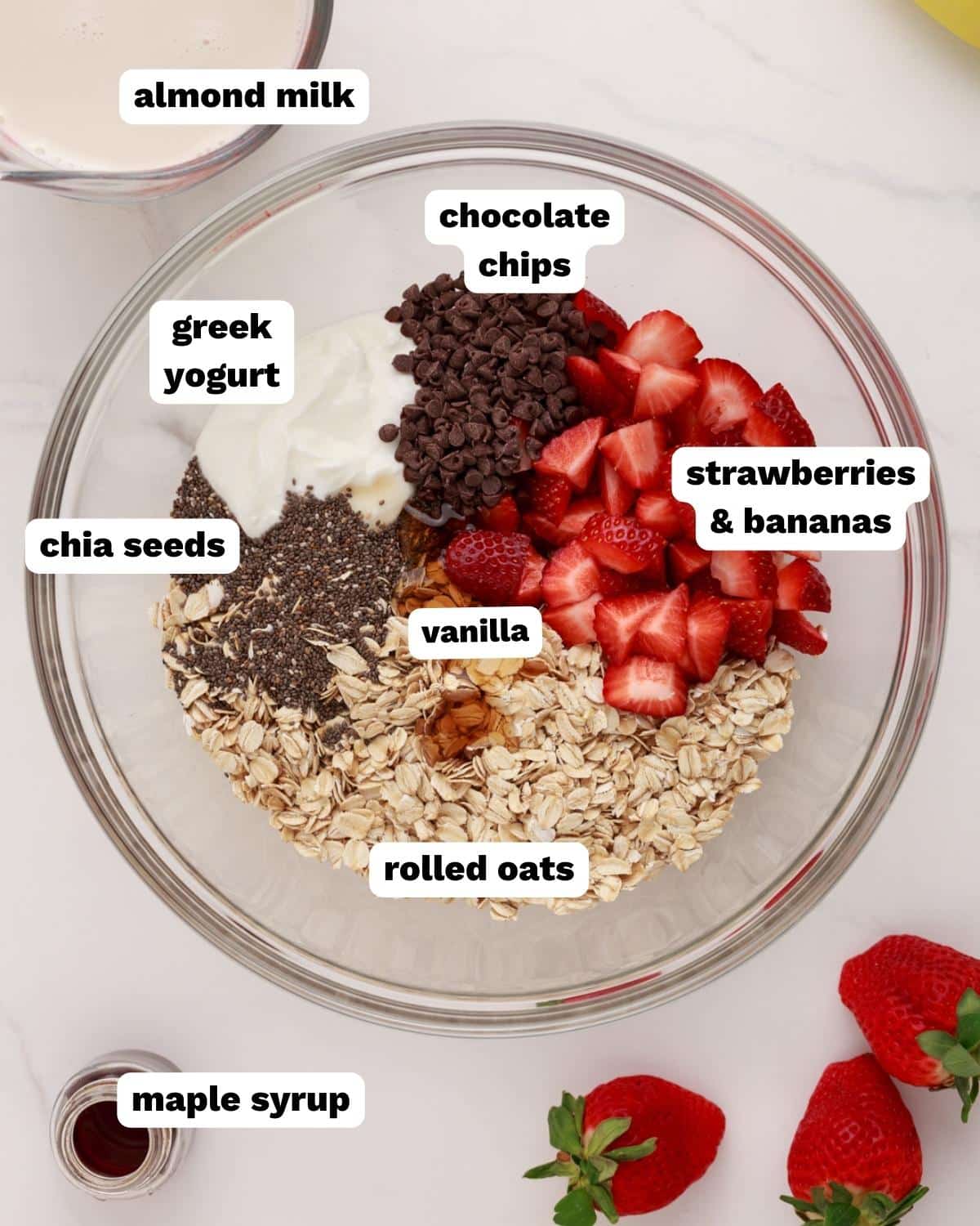 - In a bowl combine oats, almond milk, vanilla, yogurt, maple syrup, chia seeds, chocolate chips, and strawberries.