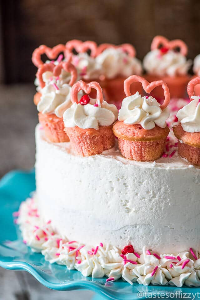 Serve your loved ones this easy-to-decorate strawberry valentine cake. Vanilla buttercream frosted strawberry cake with mini cupcakes, pink candy hearts and sprinkles.