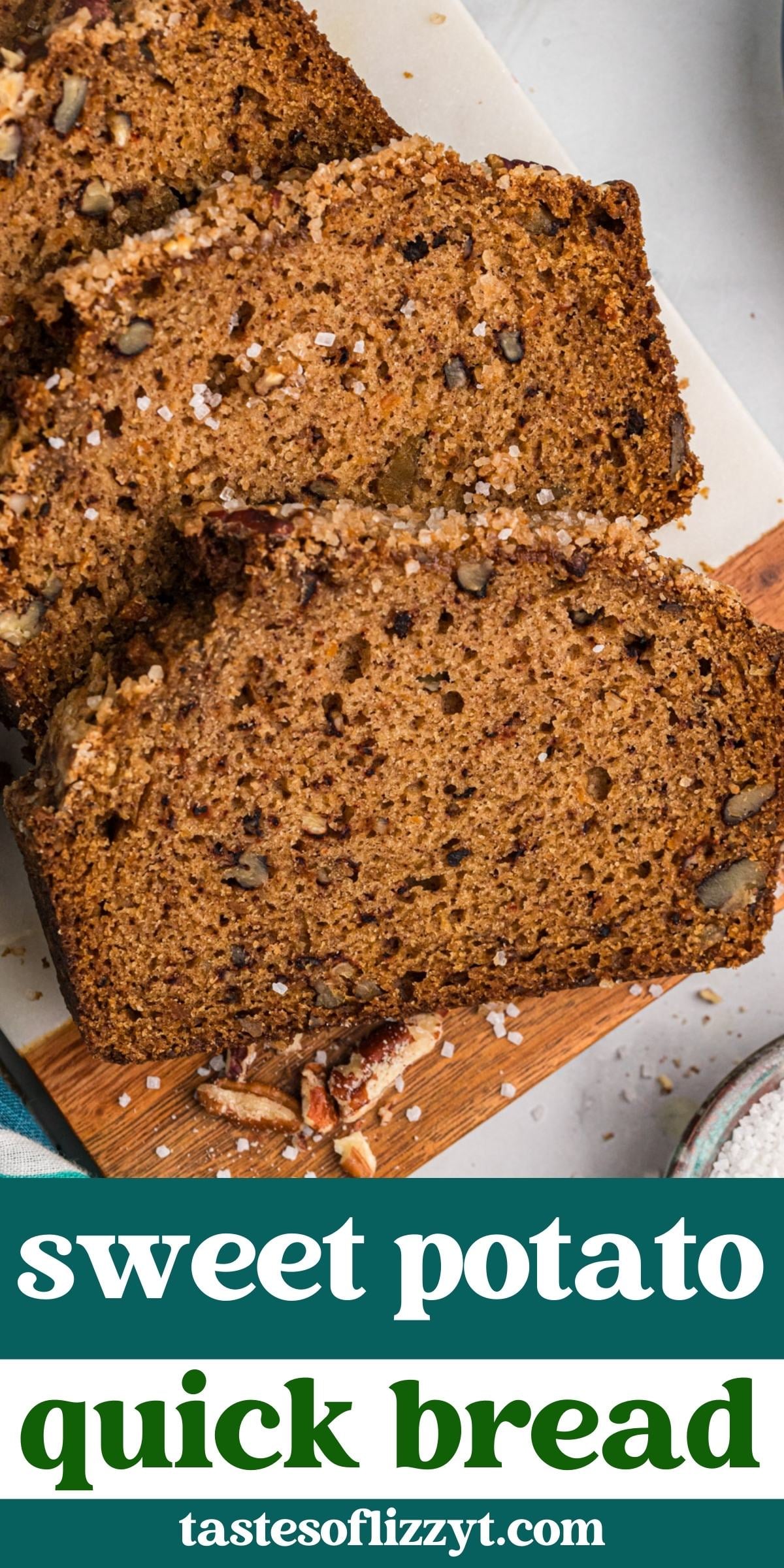 • Texture: This sweet potato loaf bakes up moist. The pecans give texture to every bite, and the coarse sugar on top adds a sparkly crunch.
