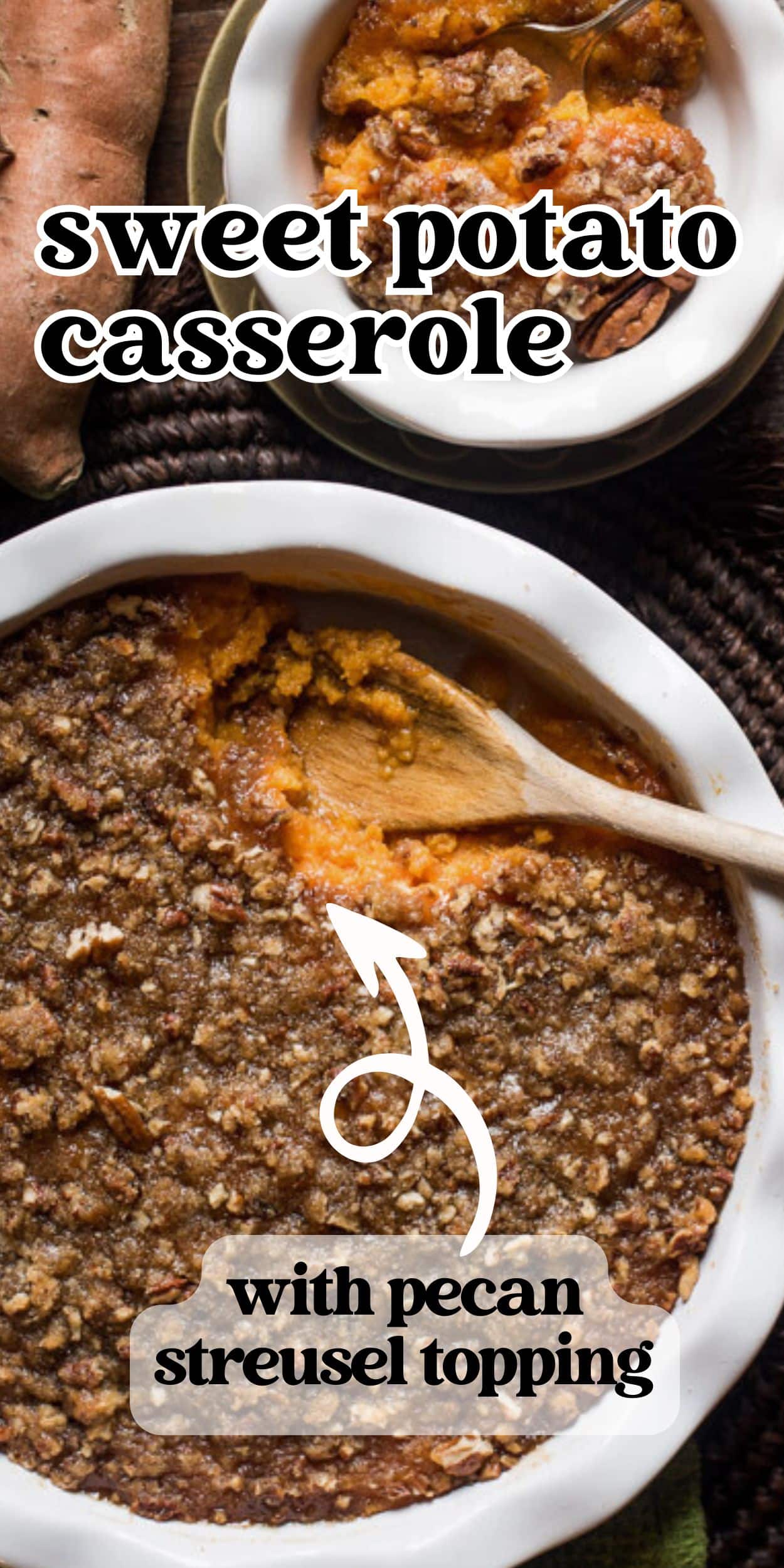 Real sweet potatoes whipped with eggs and milk make this the best sweet potato casserole with pecan streusel topping around. There’s an unmistakeable hint of vanilla that you’ll love!