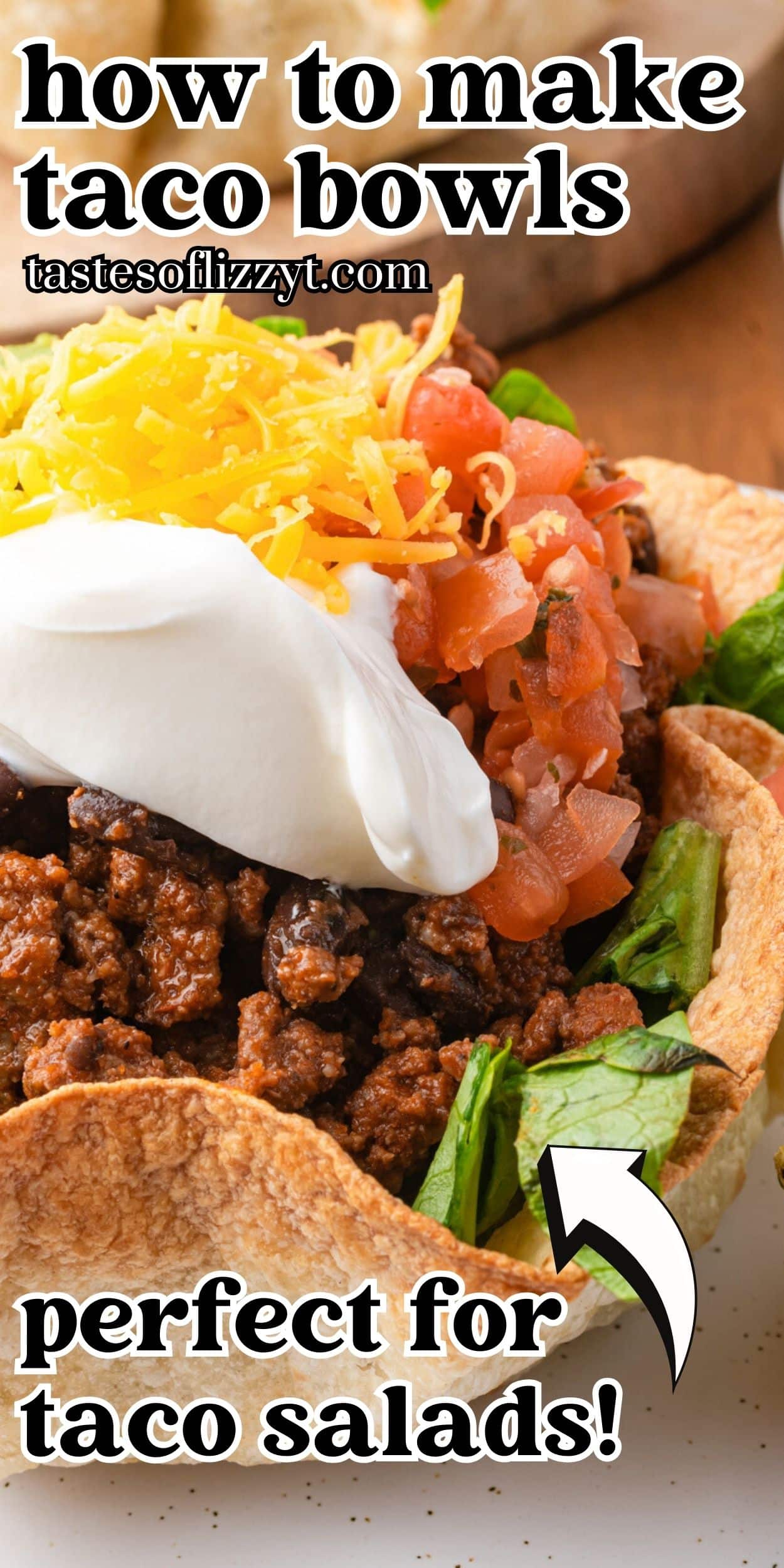 Love taco salads? Make our taco bowl recipe with lettuce and taco meat in a baked flour tortilla shell. All of the taco toppings you love, served in an edible bowl.