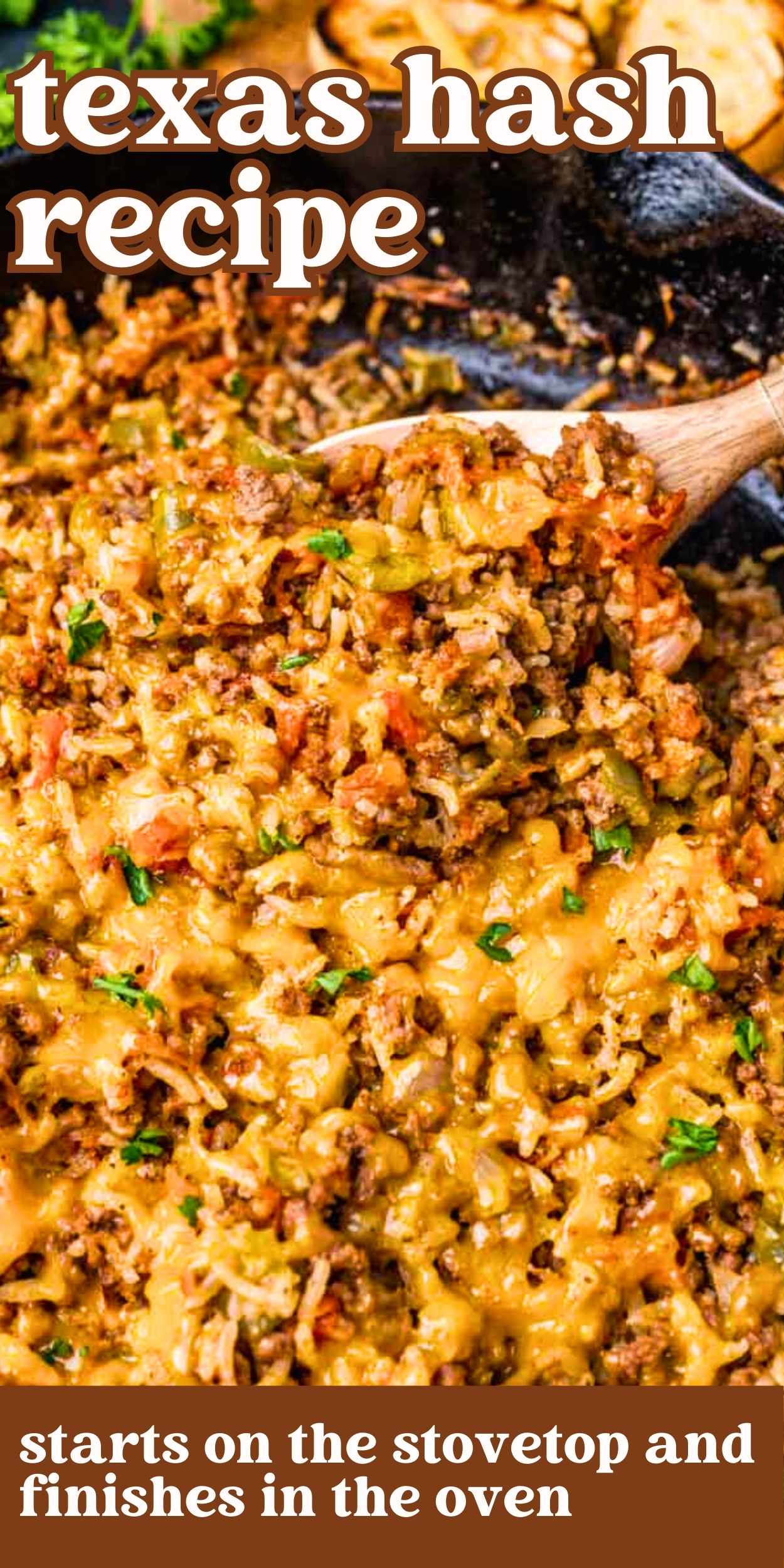 Looking for an easy dinner? Try this Texas Hash with ground beef, rice, tomatoes and pepper. Starts on the stovetop and bakes in the oven for the perfect texture.