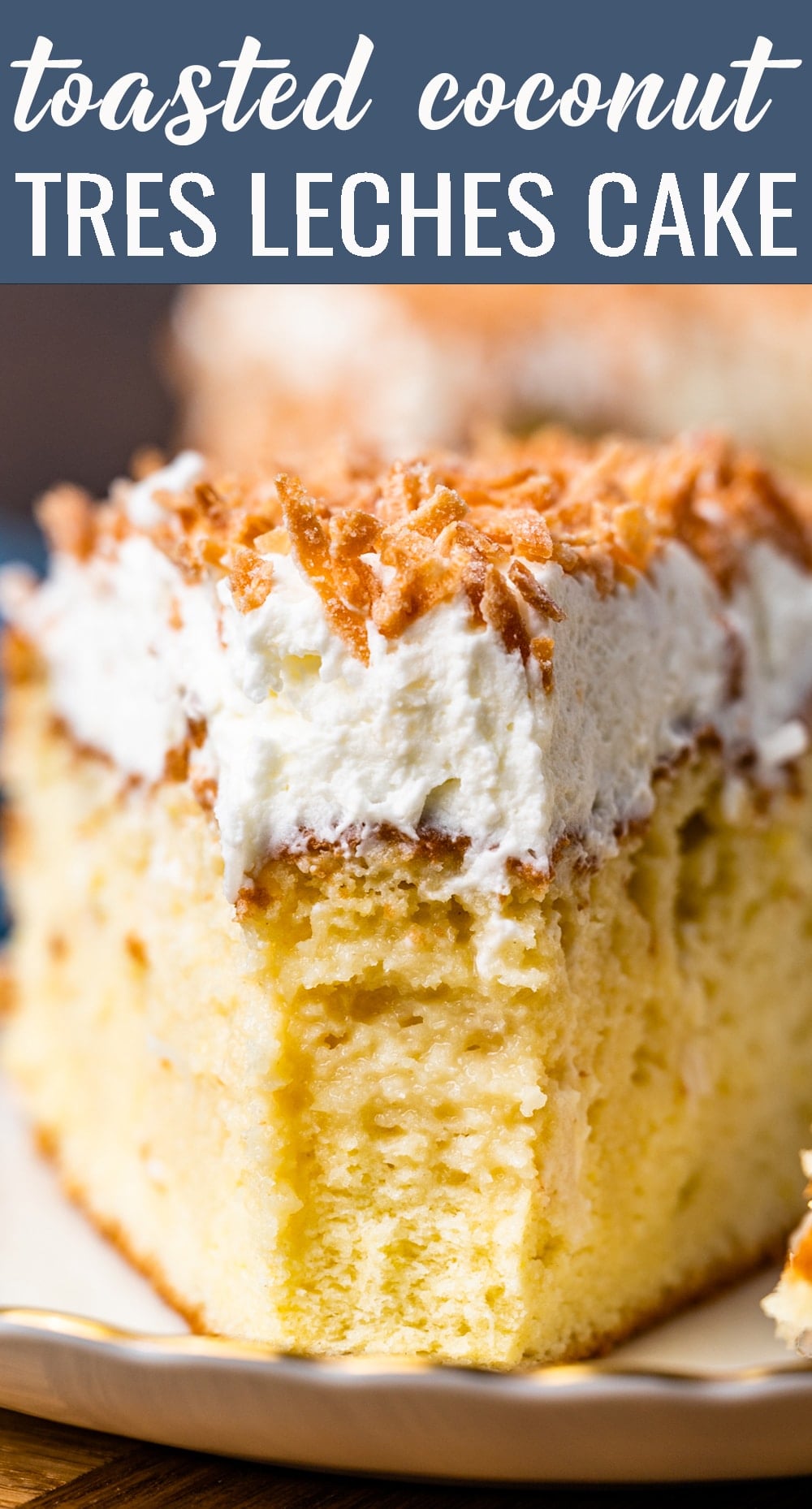 Toasted Coconut Tres Leches Cake is a sponge cake soaked in three milks and topped with a delicate whipped topping and flaked coconut.