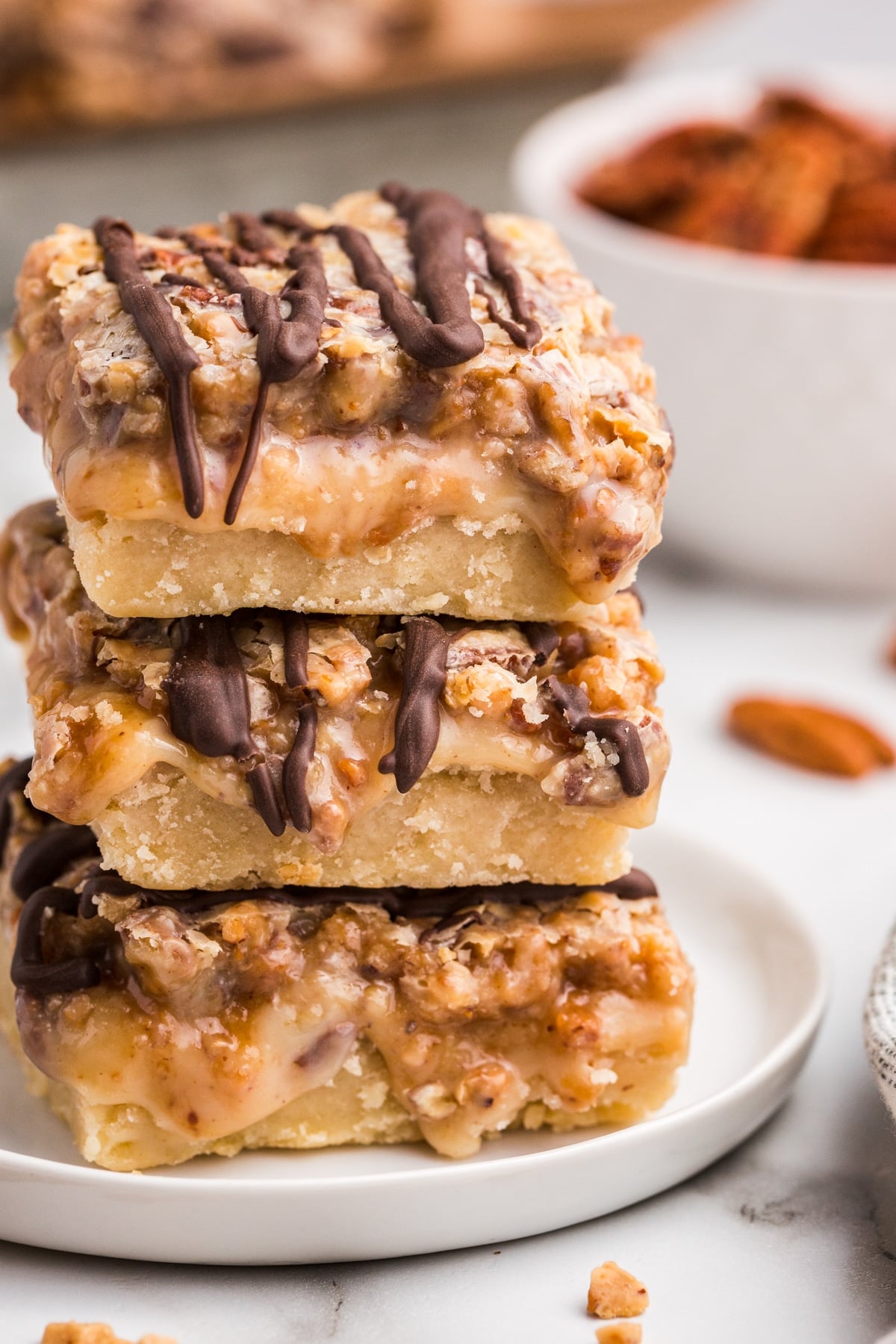 In many ways, they remind me of our millionaire bars and have a similar flavor to our pecan tassies. They are a new twist on that classic shortbread cookie recipe. If shortbread, pecans and chocolate are your thing, you’ll enjoy these bars too.