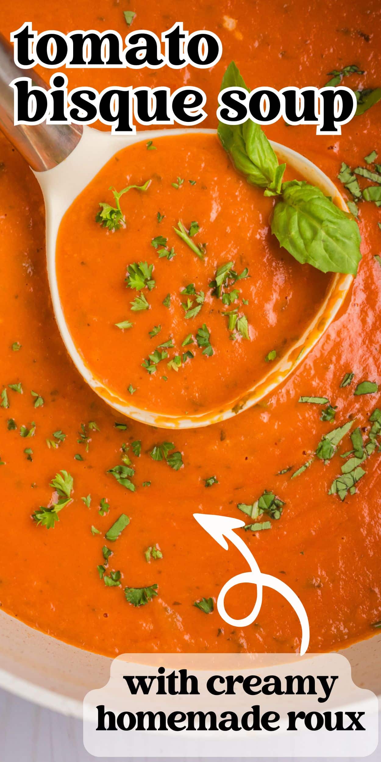Thick and creamy tomato bisque soup is the perfect weekend lunch recipe with a side of garlic bread or buttery grilled cheese!