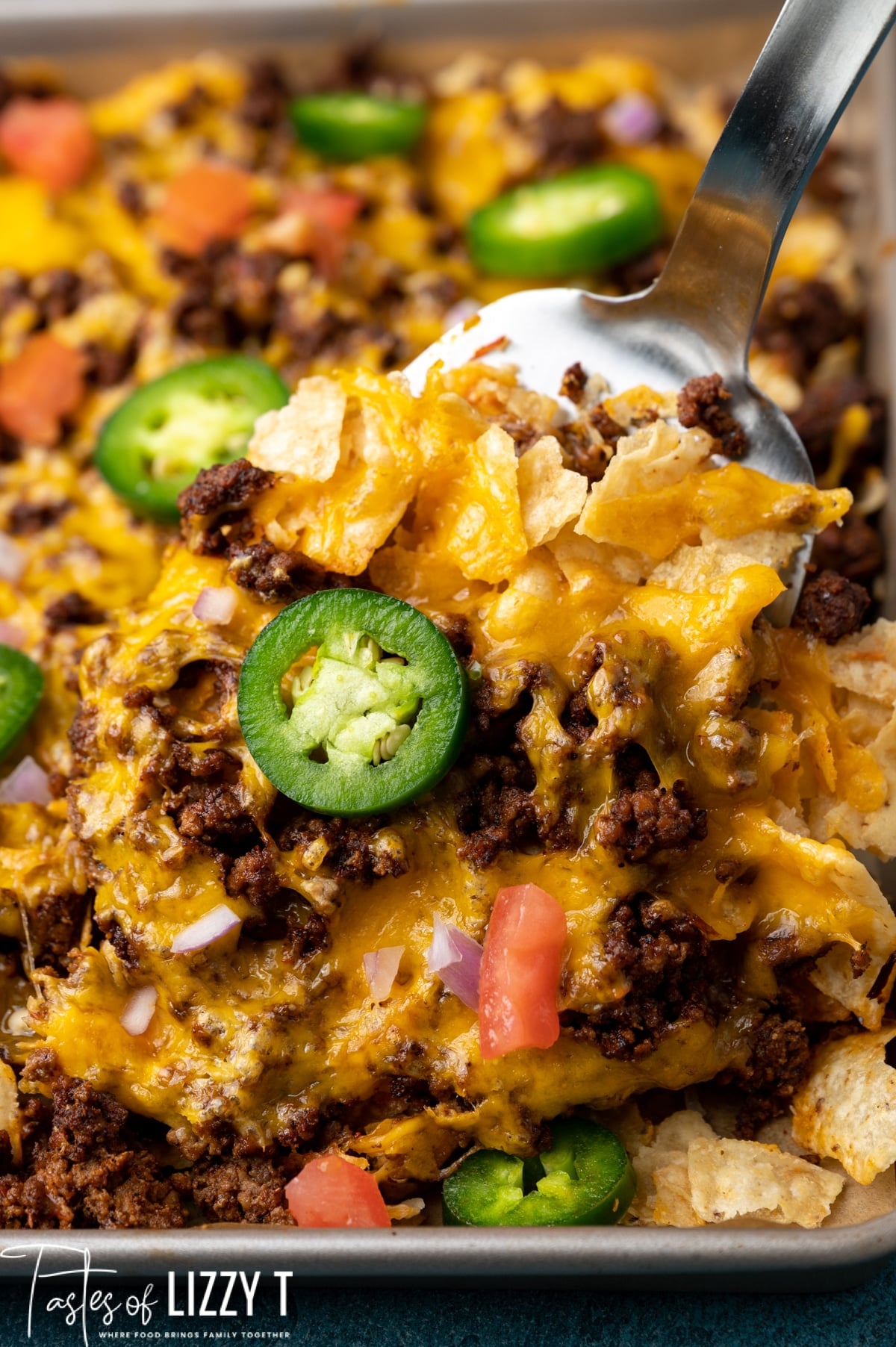 - On top of the tortilla chips, spread half the taco meat, then sprinkle on 2 cups of cheese. Then, use the other half of the tortilla chips, the rest of the taco meat (are you seeing a pattern here?) , and the remaining two cups of cheese. Plus a little more for good measure if you are a cheese lover like me!