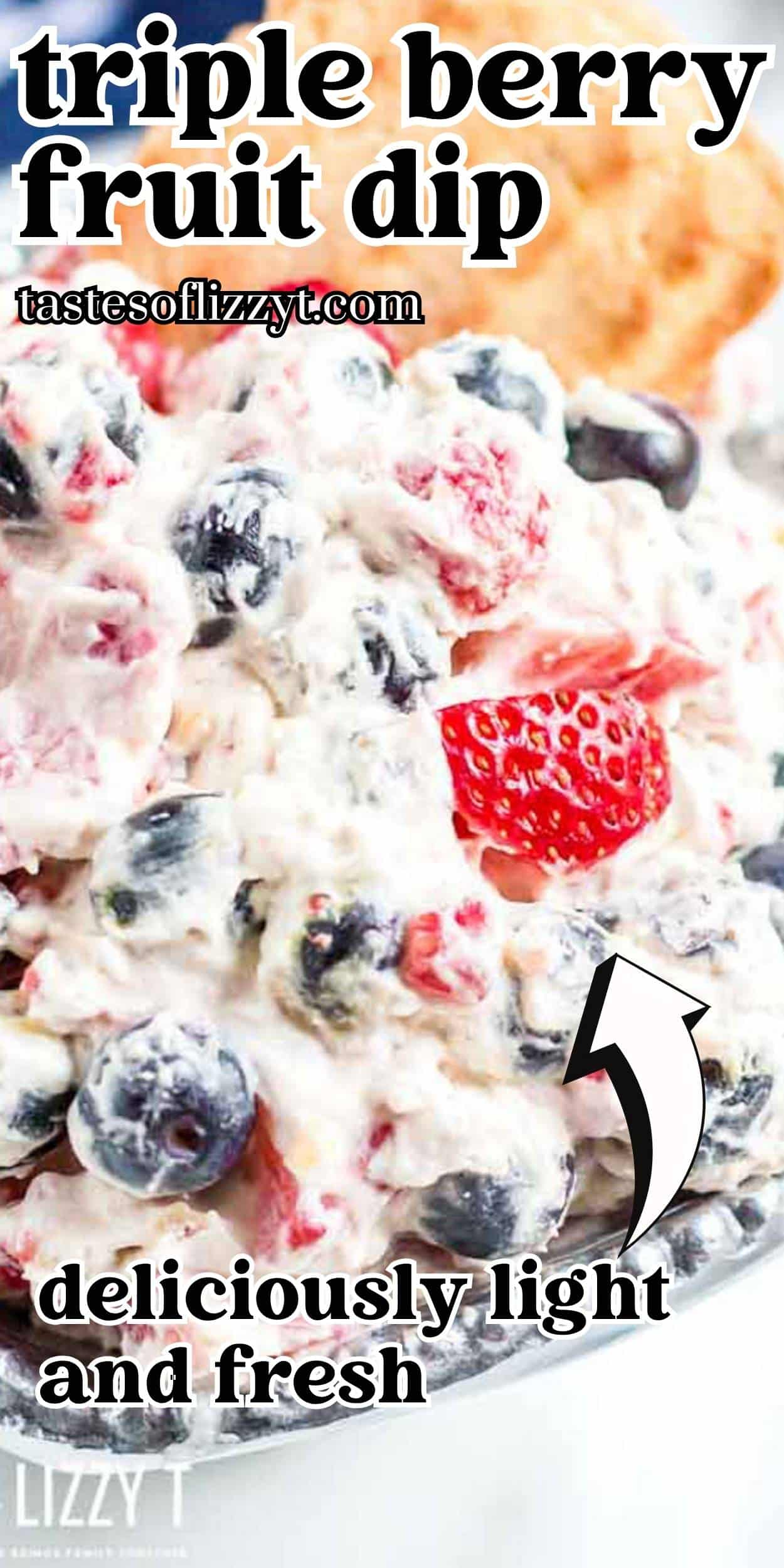 This Triple Berry Fruit Dip is a light patriotic dessert that you can serve with cut out pie crust, vanilla wafers, or pretzels.