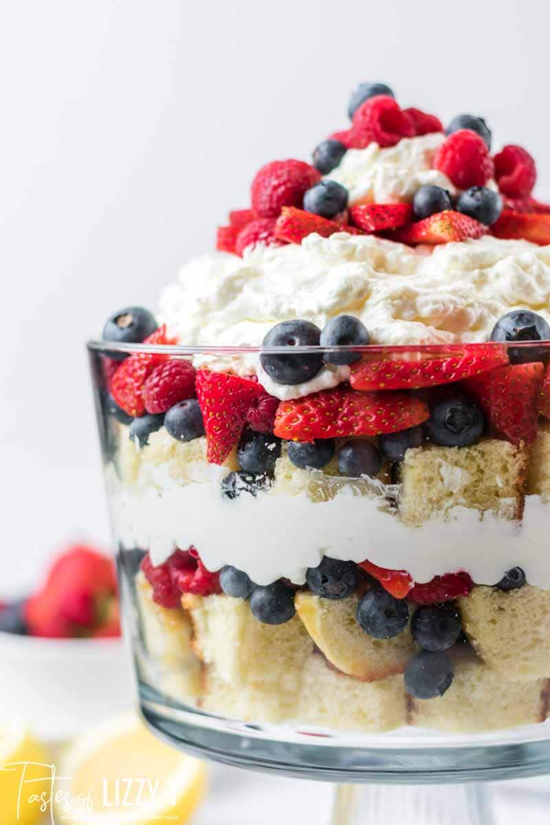 - Repeat the layers of cake, berries and whipped cream. Top your trifle with a few berries of each kind and a dollop more of whipped cream.